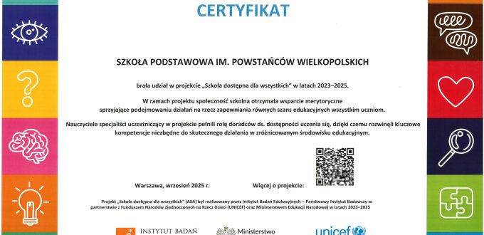 W ubiegłym roku szkolnym nasza szkoła brała udział w ogólnopolskim projekcie ,,Szkoła dostępna dla wszystkich”, którego celem było podniesienie kompetencji nauczycieli i specjalistów w zakresie wspierania uczniów ze zróżnicowanymi potrzebami edukacyjnymi, zwłaszcza w obszarze zdrowia psychicznego oraz integracji, a także stworzenie dla nich bezpiecznego środowiska szkolnego. Projekt został pomyślnie zakończony, a szkoła otrzymała certyfikat potwierdzający […]