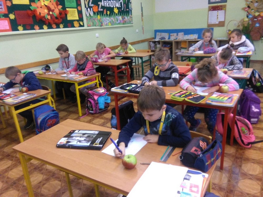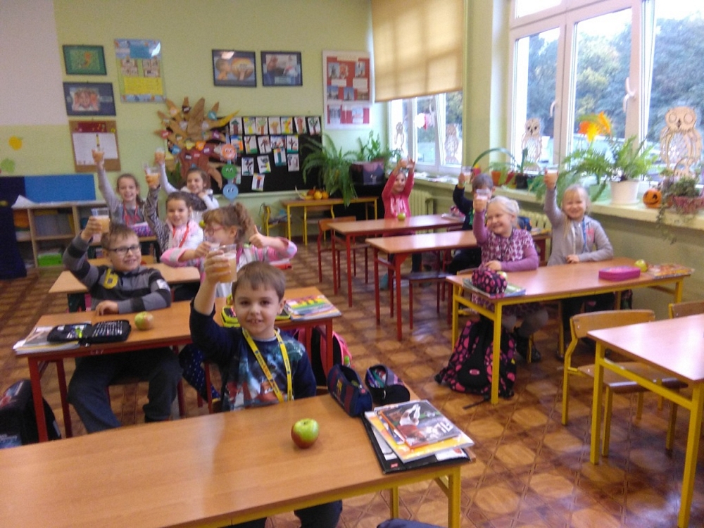 Dzień ten był okazją do skosztowania jabłkowych pyszności m.in. świeżego soku jabłkowego i pachnących jabłuszek. Na lekcję została zaproszona pani dyrektor Danuta Buryta –Arndt, która przedstawiła dzieciom zalety spożywania owoców ·w szkole i zdrowego śniadania. Nadmieniła także, iż szkoła jest objęta programem