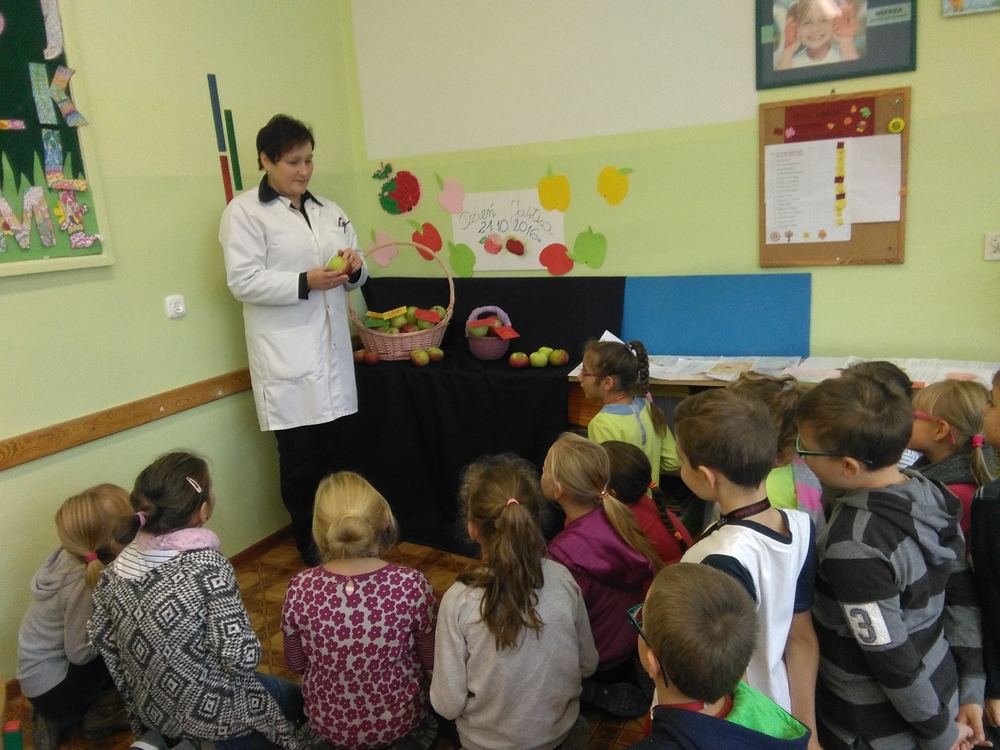 z pielęgniarką szkolną, panią Moniką Szymańską, która opowiadała o roli witamin zawartych w jabłku i dobrych, prawidłowych nawykach żywieniowych.