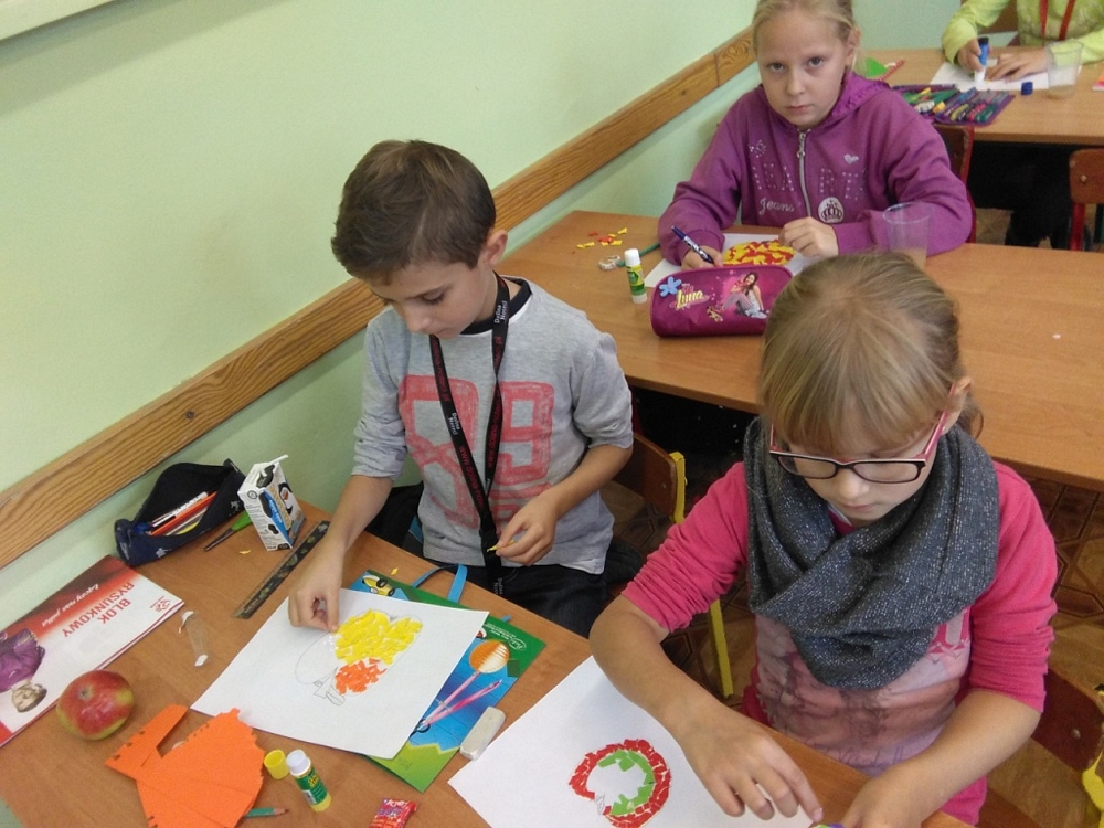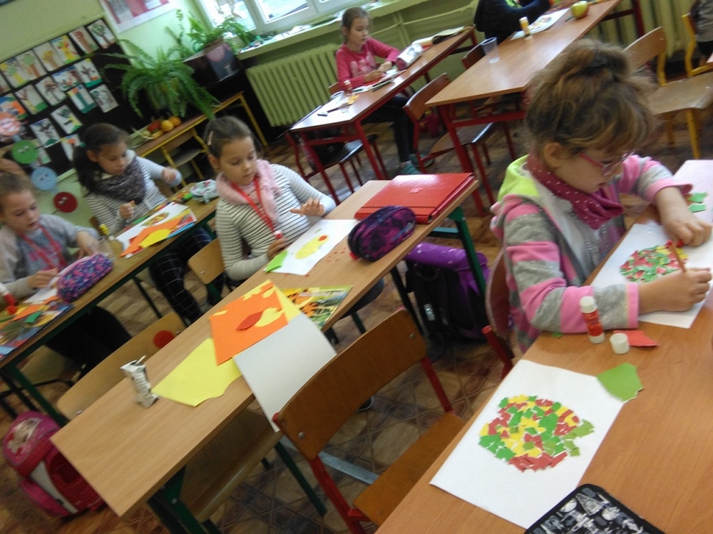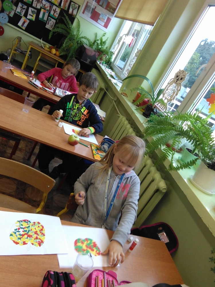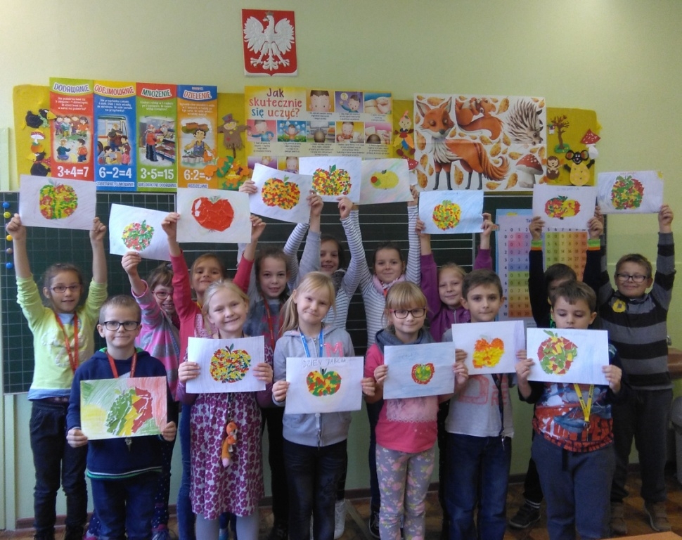 „Owoce w szkole”, zachęcającego uczniów do propagowania zdrowego i aktywnego stylu życia. Na zajęciach plastycznych dzieci przygotowały piękne wydzieranki, których tematem były oczywiście jabłka.