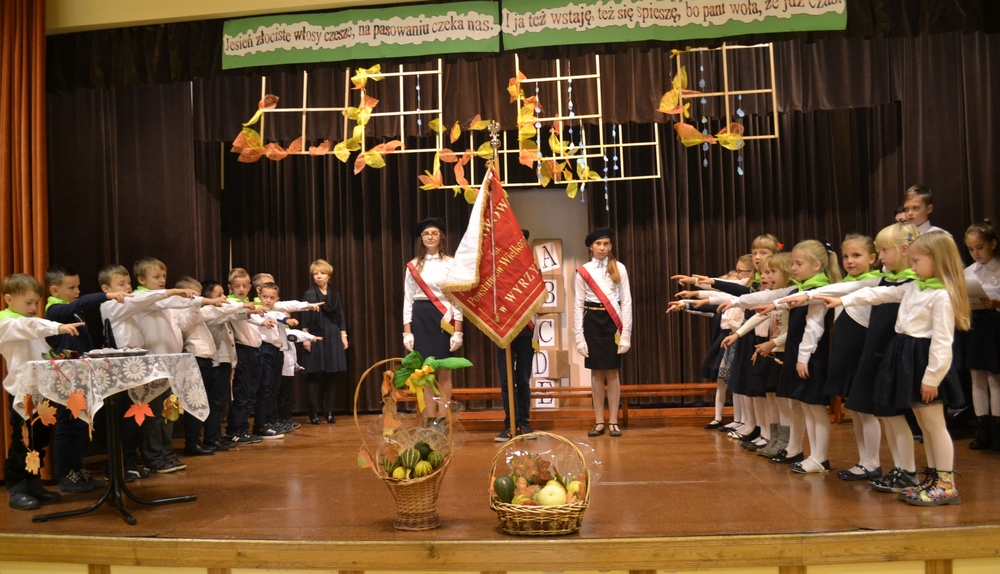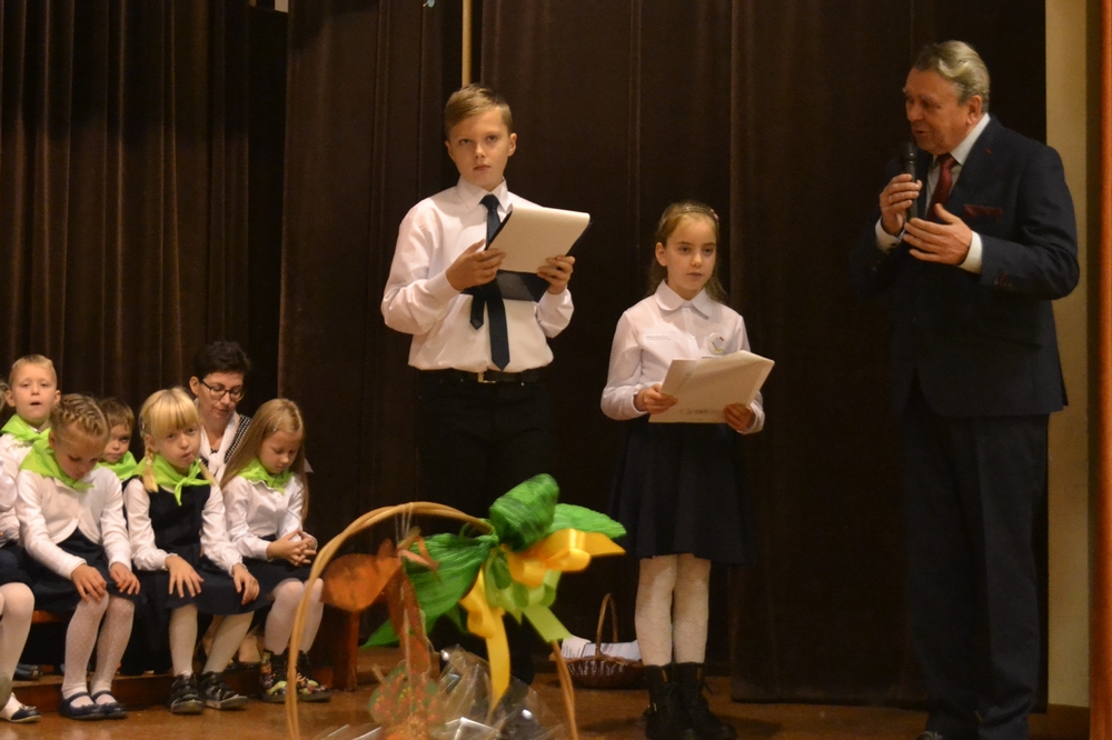 Piękną, jesienną oprawę plastyczną uroczystości przygotowały panie: Elżbieta Kwasek i Katarzyna Chyła, a przedstawiciele Małego Samorządu, Zuzia Kozimor i Bartek Tojza z klasy III b, świetnie poradzili sobie z rolą konferansjerów. Dziękujemy.