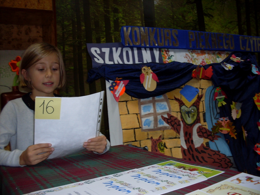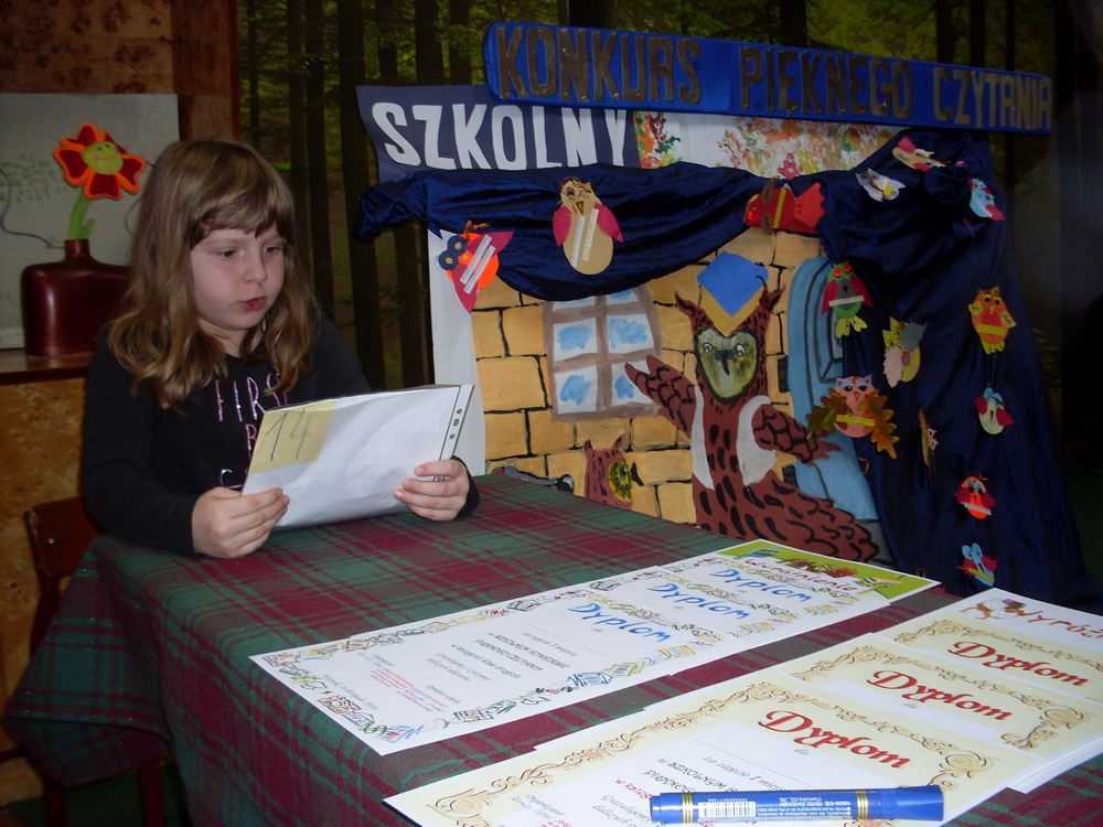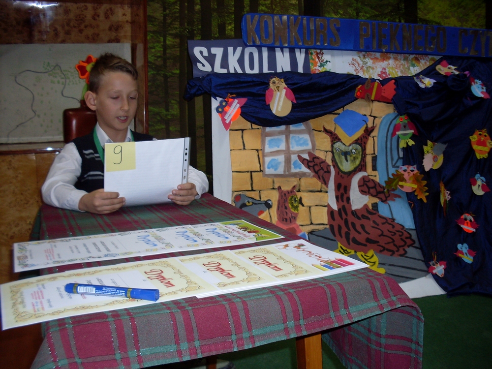 Wysoko postawiona poprzeczka pozwoliła na wyłonienie reprezentantów poszczególnych klas do Gminnego Konkursu Pięknego Czytania, który odbędzie się 29 listopada br. Tylko przedstawiciele trzech pierwszych miejsc z poszczególnych kategorii zakwalifikowali się do etapu gminnego. Zwycięzcy otrzymają dyplomy za zajęte miejsca. Dekoracją zajęły się panie ze świetlicy szkolnej. Motywem przewodnim były sowy. Wszakże to ptaki mądre, ciekawe i pożyteczne. Uśmiechy na twarzach uczestników świadczyły o tym, że warto brać udział w konkursach. Życzymy dalszych sukcesów na wyższych szczeblach konkursu.