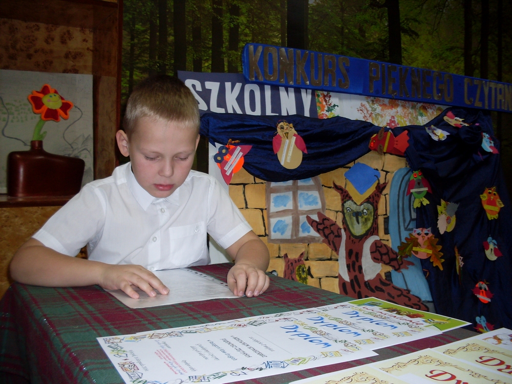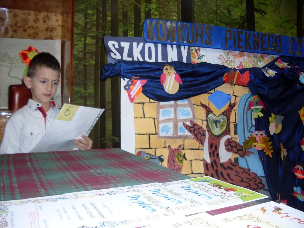 Wysoko postawiona poprzeczka pozwoliła na wyłonienie reprezentantów poszczególnych klas do Gminnego Konkursu Pięknego Czytania, który odbędzie się 29 listopada br. Tylko przedstawiciele trzech pierwszych miejsc z poszczególnych kategorii zakwalifikowali się do etapu gminnego. Zwycięzcy otrzymają dyplomy za zajęte miejsca. Dekoracją zajęły się panie ze świetlicy szkolnej. Motywem przewodnim były sowy. Wszakże to ptaki mądre, ciekawe i pożyteczne. Uśmiechy na twarzach uczestników świadczyły o tym, że warto brać udział w konkursach. Życzymy dalszych sukcesów na wyższych szczeblach konkursu.