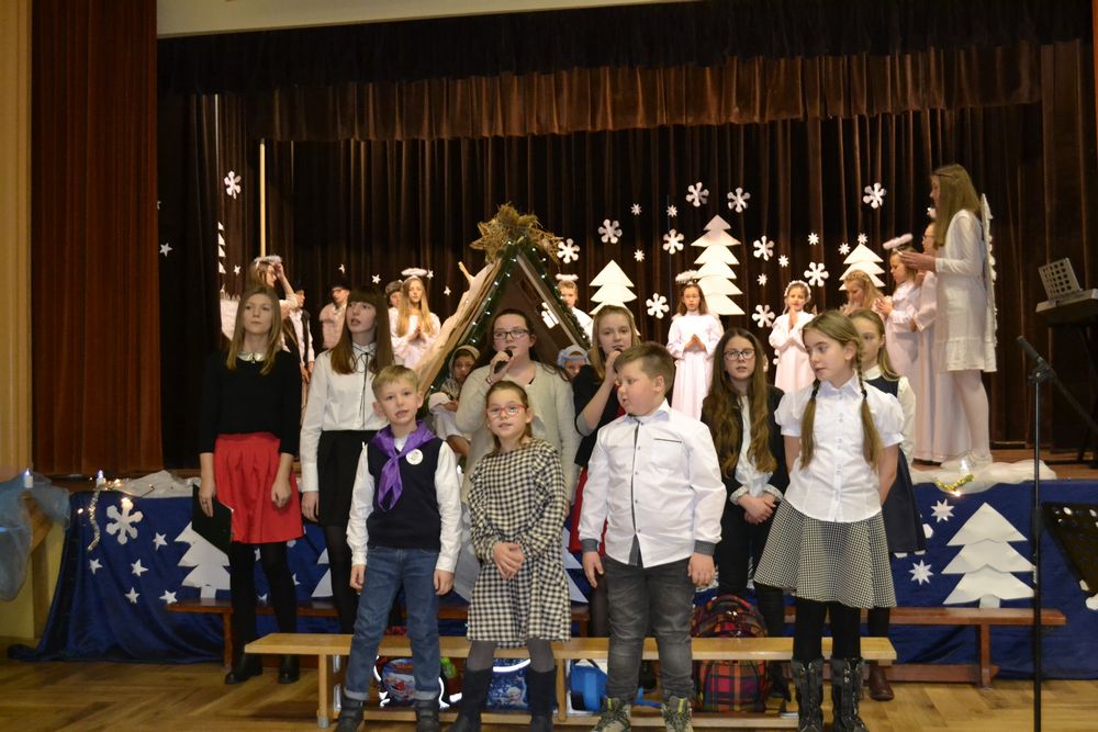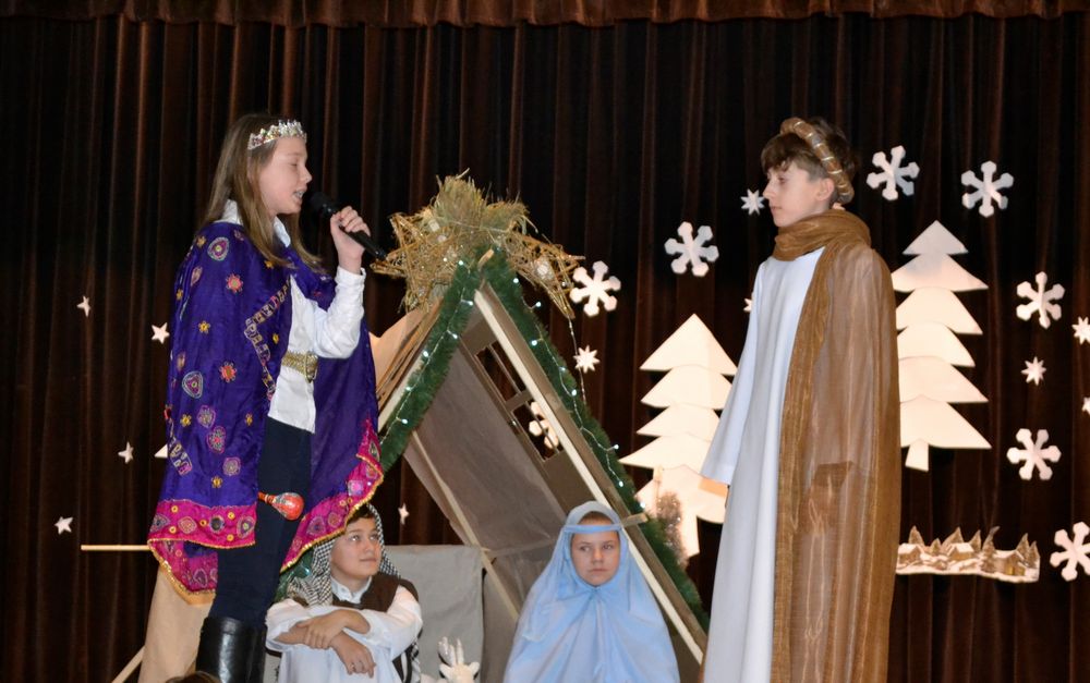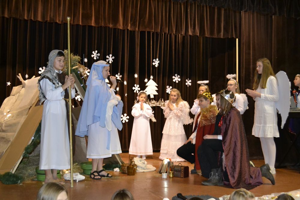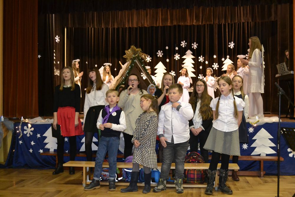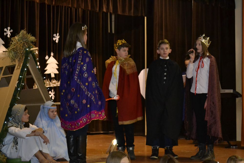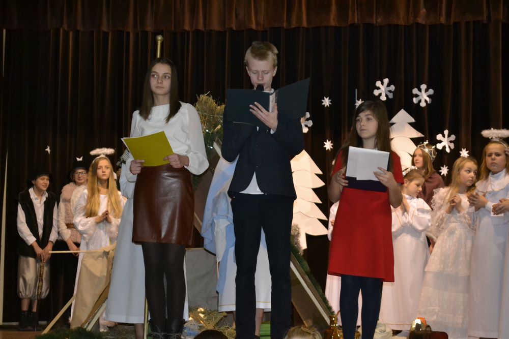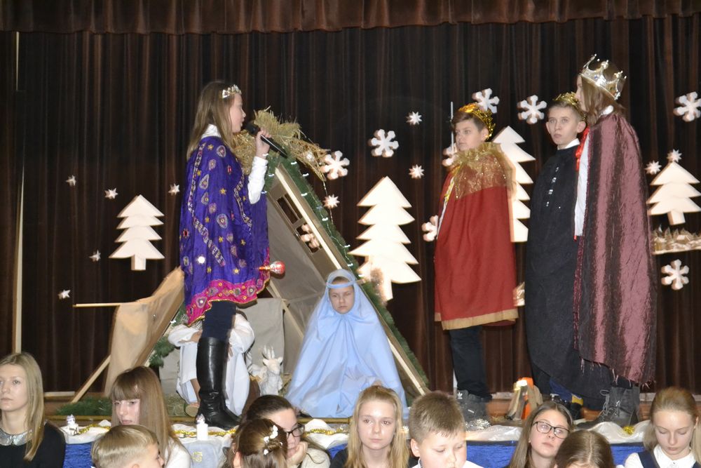 Przedstawienie rozpoczęło się pięknym śpiewem piosenki pt. ,,Jest taki dzień”. Następnie w scenie pierwszej pojawił się żołnierz, który oznajmił, że cesarz August ogłosił w całym państwie spis ludności. Ze sceny drugiej dowiedzieliśmy się, że Józef z Maryją szukali noclegu w Betlejem, a w scenie trzeciej, że na świat przyszedł długo oczekiwany i zapowiadany przez proroków Syn Boży – Zbawiciel. W kolejnej odsłonie poznaliśmy zarozumiałego i władczego Heroda, kuszonego przez diabła, który namawiał króla do zgładzenia małego Jezusa. W przedostatniej scenie widzieliśmy przybycie pasterzy, a w piątej trzech króli, którzy stanęli przed Dzieciątkiem, by oddać pokłon i cześć Nowonarodzonemu oraz złożyć Mu dary jako królowi, Bogu i człowiekowi. Dzięki temu mogliśmy na moment zatrzymać się i zapomnieć o przedświątecznej gorączce przygotowań, aby zastanowić się nad sensem i znaczeniem tych cudownych, magicznych, rodzinnych świąt. Bóg przychodzi do nas w osobie malutkiego Dzieciątka o wielkim sercu, które uczy nas miłości do każdego człowieka. Nie zapominajmy, że we współczesnym, zmaterializowanym świecie, gdzie rządzą pieniądz, brak czasu i kariera jest drugi człowiek, nasz bliźni, nasz brat. Właśnie to chcieli przekazać nam młodzi aktorzy, którzy wcielając się w rolę Świętej Rodziny, pasterzy, trzech mędrców ze wschodu, złego króla Heroda i diabła pragnęli uświadomić nam, że warto czasem zwolnić i zastanowić nad swoim życiem, odpowiedzieć sobie, co jest najważniejsze, jakie wartości się liczą albo powinny liczyć.