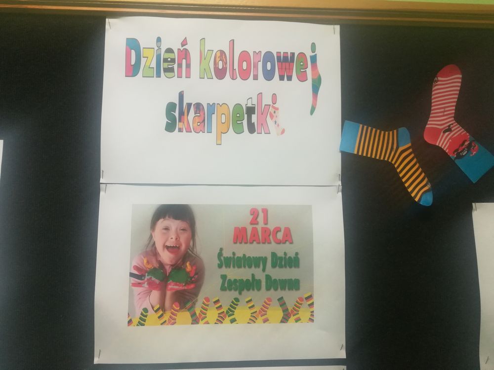 W Szkole Podstawowej im. Powstańców Wielkopolskich w Wyrzysku została zorganizowana akcja Dzień kolorowej skarpetki, która symbolizowała nasz szacunek i zjednoczenie z ludźmi z zespołem Downa. Dodatkowo w ramach integracji uczniów ze specjalnymi potrzebami edukacyjnymi została przedstawiona prezentacja na temat zespołu Downa dla klasy IIe. Podczas tego dnia większość uczniów i nauczycieli przyłączyła się do akcji, za co z całego serca dziękuję w imieniu swoim i Mateusza – ucznia z zespołem Downa. Kolorowe skarpetki nie do pary to symbol niedopasowania genotypowego, z jakim borykają się osoby z zespołem Downa. Światowy Dzień Zespołu Downa został ustanowiony w 2005 roku z inicjatywy Europejskiego Stowarzyszenia Zespołu Downa. Od 2012 organizowany jest pod patronatem ONZ. Z tej okazji w wielu miastach w Polsce organizowane są różne wydarzenia mające na celu promowanie praw osób z zespołem Downa do pełnego uczestnictwa w życiu społecznym i zwiększanie świadomości społecznej na temat trisomii 21. To nie przypadek, że Światowy Dzień Zespołu Downa obchodzony jest 21. marca. Wada ta polega na tym, że w 21 parze chromosomów osoby z zespołem Downa zamiast dwóch, mają trzy chromosomy.