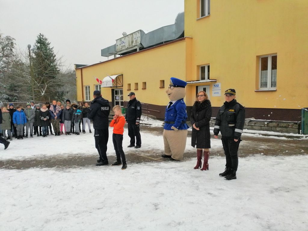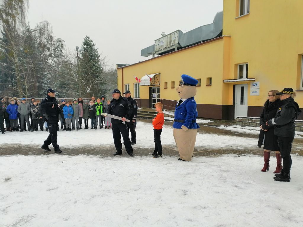 Dnia 20 grudnia 2018 r. z inicjatywy Komendanta Komisariatu Policji w Wyrzysku Marcina Towalewskiego i Komendanta Straży Miejskiej Anny Rzyduch została zorganizowana dla wszystkich uczniów naszej szkoły pogadanka połączona z pokazem na temat bezpieczeństwa związanego z używaniem petard. Naszym gościom towarzyszyli funkcjonariusze policji: st. sierż. Mateuszem Tomczyńskim i st. post. Marcinem Cichoszem oraz sierżant Pyrek, z którego obecności wszyscy się niezmiernie ucieszyli.