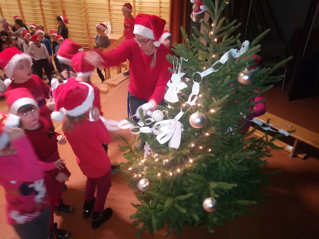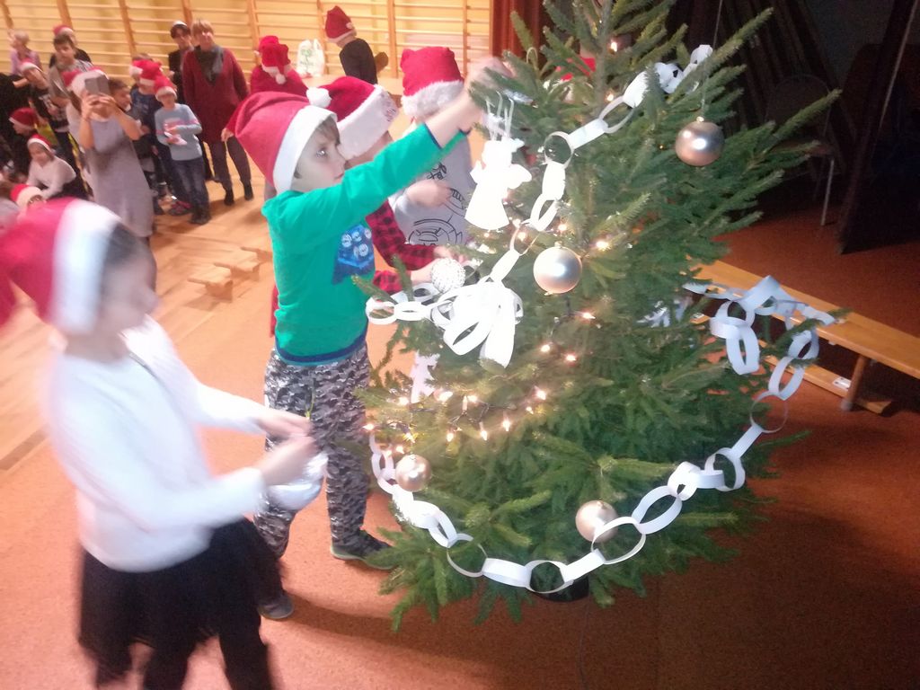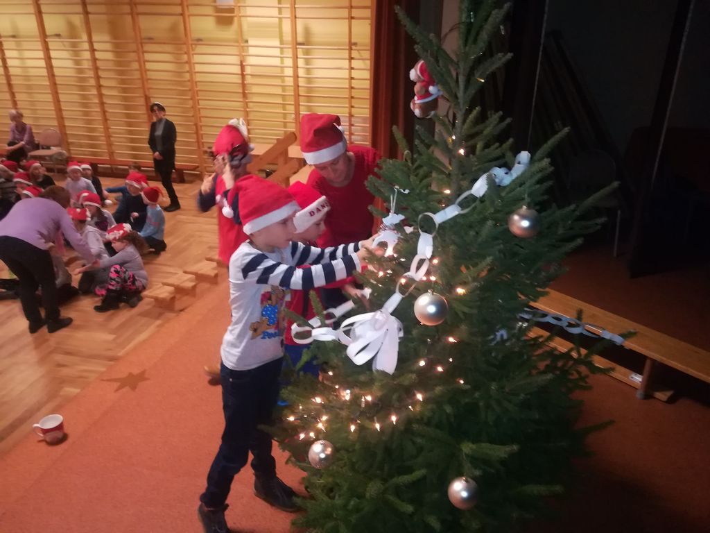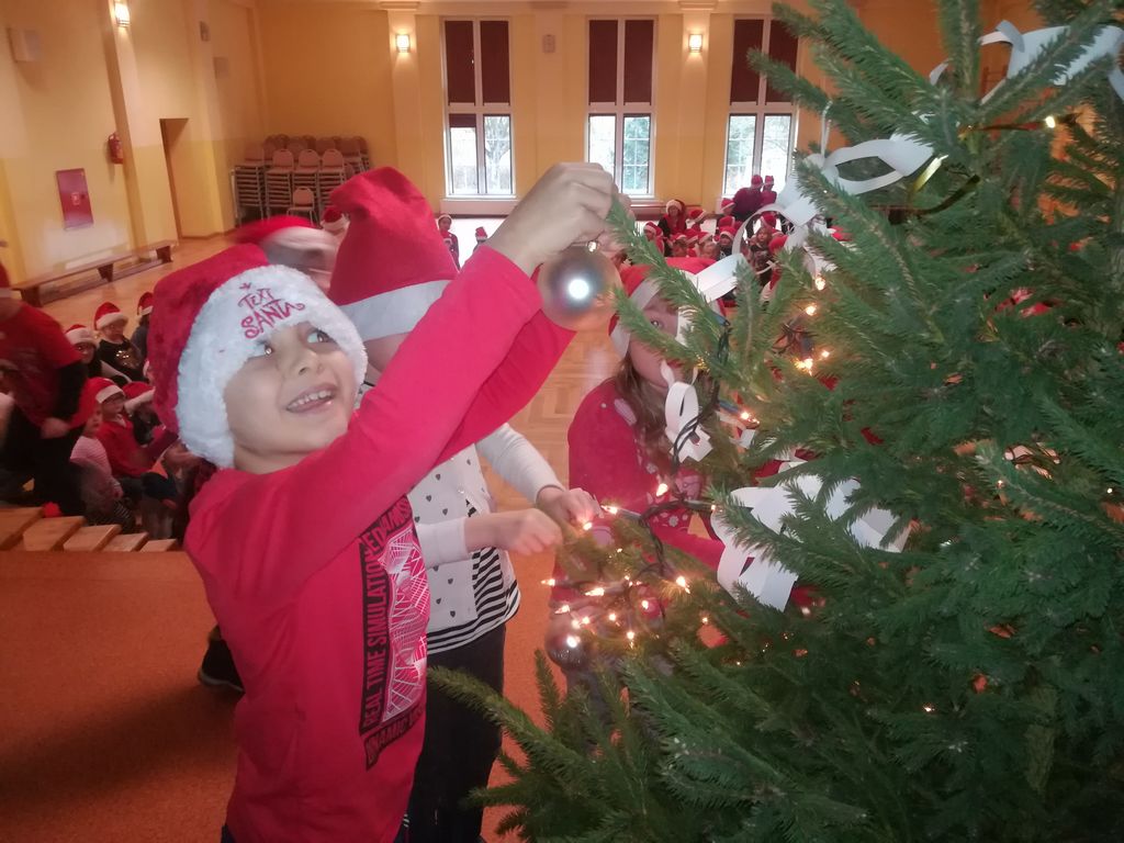 We wtorek 4 grudnia 2018r. w Szkole Podstawowej im. Powstańców Wielkopolskich w Wyrzysku uczniowie klas I-III, ubrani w mikołajkowe czapeczki, spotkali się w sali widowiskowej, aby w oczekiwaniu na przybycie Mikołaja ubrać pachnącą, świąteczną choinkę.