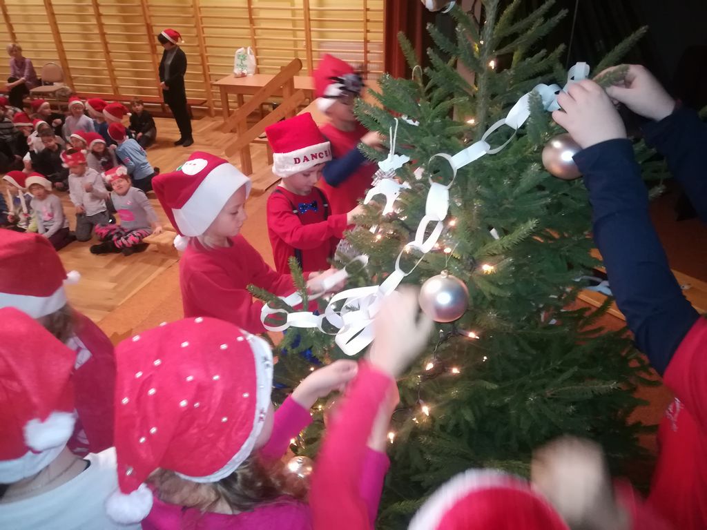 Pierwszymi gośćmi naszej uroczystości, serdecznie powitanymi przez dzieci, byli: dyrektor Szkoły p. Danuta Buryta – Arndt, przewodnicząca Rady Rodziców p. Edyta Lipkowska oraz mamy naszych uczniów. Już tradycyjnie na tę uroczystość przybyły również dzieci z oddziału przedszkolnego, który mieści się w naszej szkole. Maluchy, pod kierunkiem pani Sandry, wspaniale zaprezentowały wesoły taniec współczesny. Oczywiście występ nagrodzono gromkimi brawami. Następnie uczniowie klas drugich przedstawili żartobliwy wiersz pt. „Mikołaj”, po czym nadszedł czas na ozdobienie świątecznego drzewka. Najpierw symboliczną ozdobę – misia Mikołaja zawiesiła p. dyrektor. A później do choinki podchodziły kolejno dzieci ze swoimi wychowawczyniami. Przyniesione przez nich w tym roku ozdoby, często samodzielnie wykonane, miały kolor biały symbolizujący nadchodzącą zimę. W oczekiwaniu na Mikołaja uczniowie zaśpiewali zimową piosenkę „Pada śnieg”. A potem na głośny wielokrotny okrzyk „zapraszamy” pojawił się Mikołaj, który zadał zgromadzonym tylko jedno, ale jakże ważne, pytanie: „Byliście grzeczni?” Po otrzymaniu twierdzącej odpowiedzi nastąpiło wręczenie słodkich niespodzianek ufundowanych przez Radę Rodziców naszej szkoły, której serdecznie dziękujemy. Spotkanie sprawiło wszystkim wiele radości i zakończyło się pamiątkowymi zdjęciami.