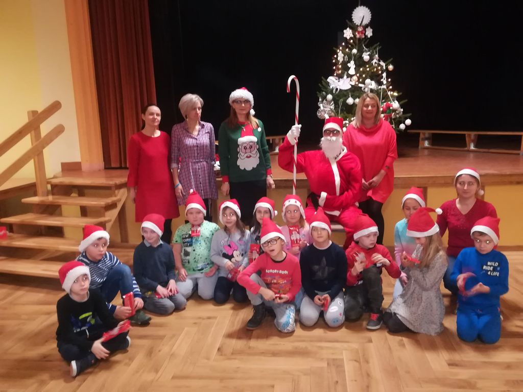 Pierwszymi gośćmi naszej uroczystości, serdecznie powitanymi przez dzieci, byli: dyrektor Szkoły p. Danuta Buryta – Arndt, przewodnicząca Rady Rodziców p. Edyta Lipkowska oraz mamy naszych uczniów. Już tradycyjnie na tę uroczystość przybyły również dzieci z oddziału przedszkolnego, który mieści się w naszej szkole. Maluchy, pod kierunkiem pani Sandry, wspaniale zaprezentowały wesoły taniec współczesny. Oczywiście występ nagrodzono gromkimi brawami. Następnie uczniowie klas drugich przedstawili żartobliwy wiersz pt. „Mikołaj”, po czym nadszedł czas na ozdobienie świątecznego drzewka. Najpierw symboliczną ozdobę – misia Mikołaja zawiesiła p. dyrektor. A później do choinki podchodziły kolejno dzieci ze swoimi wychowawczyniami. Przyniesione przez nich w tym roku ozdoby, często samodzielnie wykonane, miały kolor biały symbolizujący nadchodzącą zimę. W oczekiwaniu na Mikołaja uczniowie zaśpiewali zimową piosenkę „Pada śnieg”. A potem na głośny wielokrotny okrzyk „zapraszamy” pojawił się Mikołaj, który zadał zgromadzonym tylko jedno, ale jakże ważne, pytanie: „Byliście grzeczni?” Po otrzymaniu twierdzącej odpowiedzi nastąpiło wręczenie słodkich niespodzianek ufundowanych przez Radę Rodziców naszej szkoły, której serdecznie dziękujemy. Spotkanie sprawiło wszystkim wiele radości i zakończyło się pamiątkowymi zdjęciami.