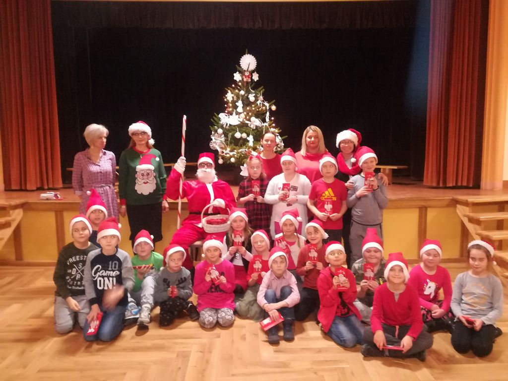 We wtorek 4 grudnia 2018r. w Szkole Podstawowej im. Powstańców Wielkopolskich w Wyrzysku uczniowie klas I-III, ubrani w mikołajkowe czapeczki, spotkali się w sali widowiskowej, aby w oczekiwaniu na przybycie Mikołaja ubrać pachnącą, świąteczną choinkę.