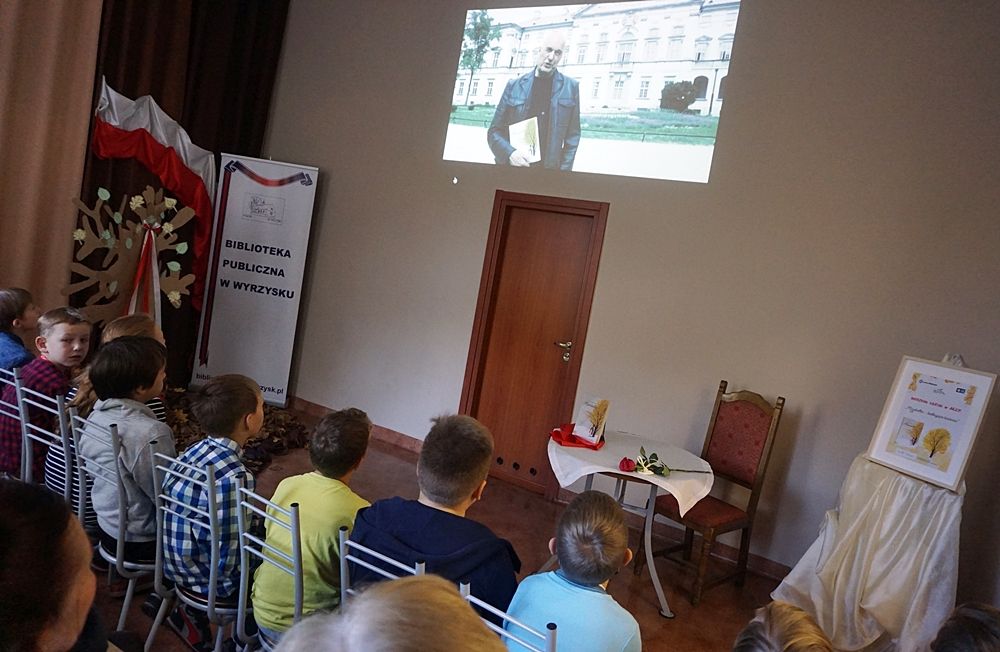 Pretekstem do tej wyjątkowej wizyty stała się książka Cezarego Harasimowicza. Jej narratorką uczynił autor mirabelkę rosnącą na warszawskich Nalewkach. To ona prezentuje koleje ludzkich losów na tle trudnej historii: wojny i okupacji, komunizmu, stanu wojennego. Udaje jej się przetrwać ciężkie próby czasu, a przegrywa z… apartamentowcem. Opowieść kończy się jednak szczęśliwie. Do lektury książki zachęcała uczniów pani Barbara Pawlak, a swój całkiem prawdziwym pierwszy dzień w szkole w okupowanej Polsce zrelacjonowała pani Maria Graczyk. Ta opowieść bardzo poruszyła dzieci, za co nagrodziły seniorkę brawami, a kierownik biblioteki pani Katarzyna Turbiak dołączyła do tych podziękowań bukiet kwiatów. Następnie uczniowie wzięli udział w warsztatach „ Mirabelka- kiełkująca historia w 100licy”, które zostały zwieńczone posadzeniem drzewka przy budynku Miejsko-Gminnego Ośrodka Kultury . Na wiosnę swoje listki rozwinie tam: mirabelka!