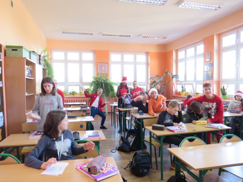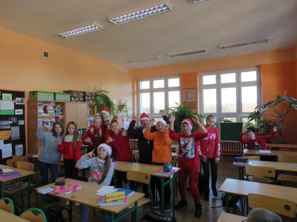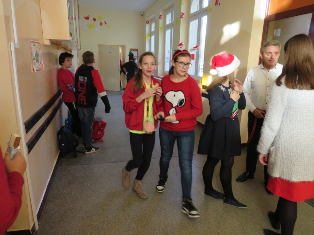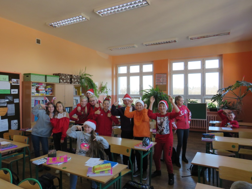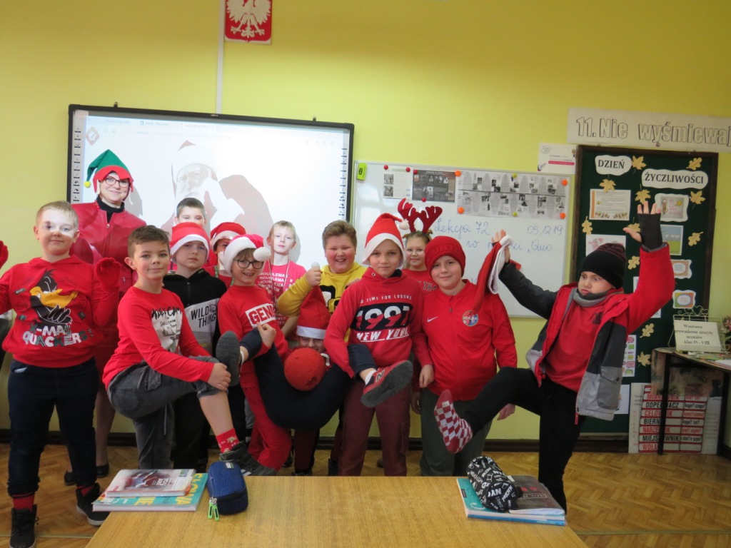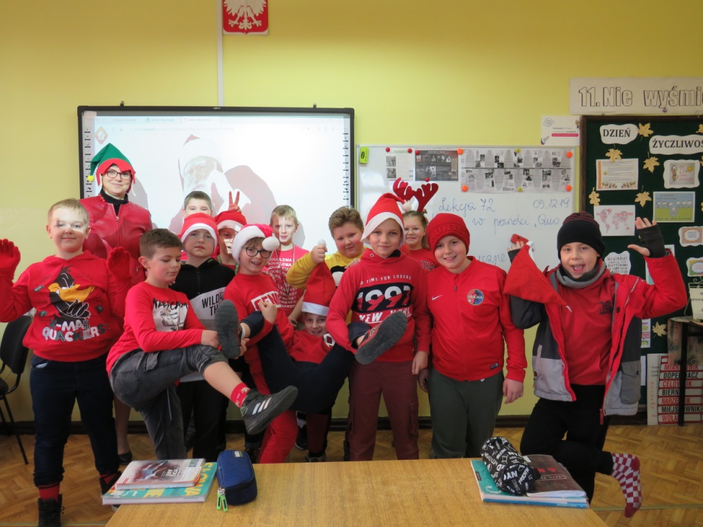 Zgodnie z pomysłem Samorządu Uczniowskiego uczniowie i pracownicy szkoły założyli czerwony, świąteczny element stroju. Chcieliśmy nie tylko podkreślić, że atmosfera świąt jest już wyczuwalna, ale także, by pokazać swą solidarność z klasową i szkolną społecznością. Czerwień widniała na butach, czapkach, opaskach, sukienkach, spodniach, sweterkach, a nawet na skarpetkach. Niektórzy odważni zdecydowali się nawet przywdziać pełen strój Mikołaja! Brawa za odwagę i pomysłowość! Wiele klas włączyło się w akcję niemal stuprocentowo, jednak zdaniem członków samorządu i nauczycieli najbardziej zaczerwieniło się dziś w klasie 5d, której wychowawczynią jest pani Anna Kozimor. Gratulujemy! Klasa zostanie nagrodzona słodkościami na najbliższym apelu.