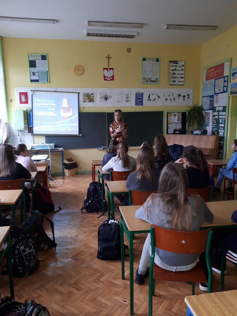 W poniedziałek 18 marca dziewczęta z klas VI wzięły udział w programie profilaktycznym „Między nami kobietkami”. Zajęcia prowadziła zaprzyjaźniona ze szkołą położna i konsultantka Centrum Informacji Always – pani Katarzyna Kuźniacka. Podczas prelekcji wyjaśniła dziewczętom, jak lepiej zrozumieć fizyczne i emocjonalne zmiany zachodzące w okresie dojrzewania, zapoznała je z prawidłową terminologią dotycząca części ciała, dorastania i rozwoju. Ponadto uświadomiła im, jak wraz z dojrzewaniem wzrasta odpowiedzialność za dbałość o swoje ciało oraz jak ważne jest od samego początku wyrobienie właściwych nawyków higienicznych związanych z cyklem menstruacyjnym kobiet. Dziewczęta z zainteresowaniem słuchały przygotowanej specjalnie dla nich pogadanki oraz obejrzały prezentację multimedialną. Na zakończenie spotkania wszystkie dziewczęta otrzymały pakiet zawierający zestaw materiałów edukacyjnych. Znalazły się w nim informacje o zmianach zachodzących w okresie dojrzewania oraz próbki produktów higienicznych.