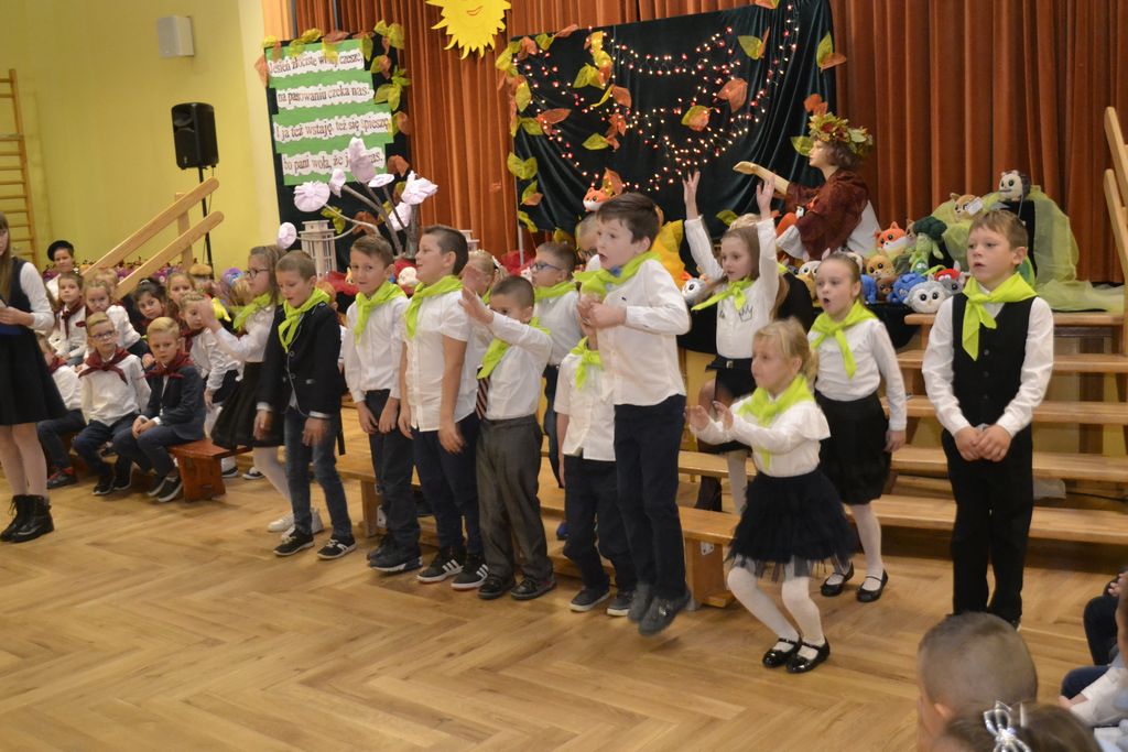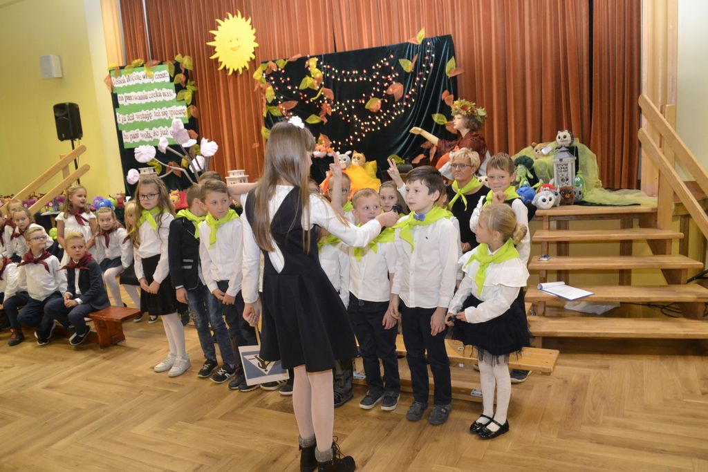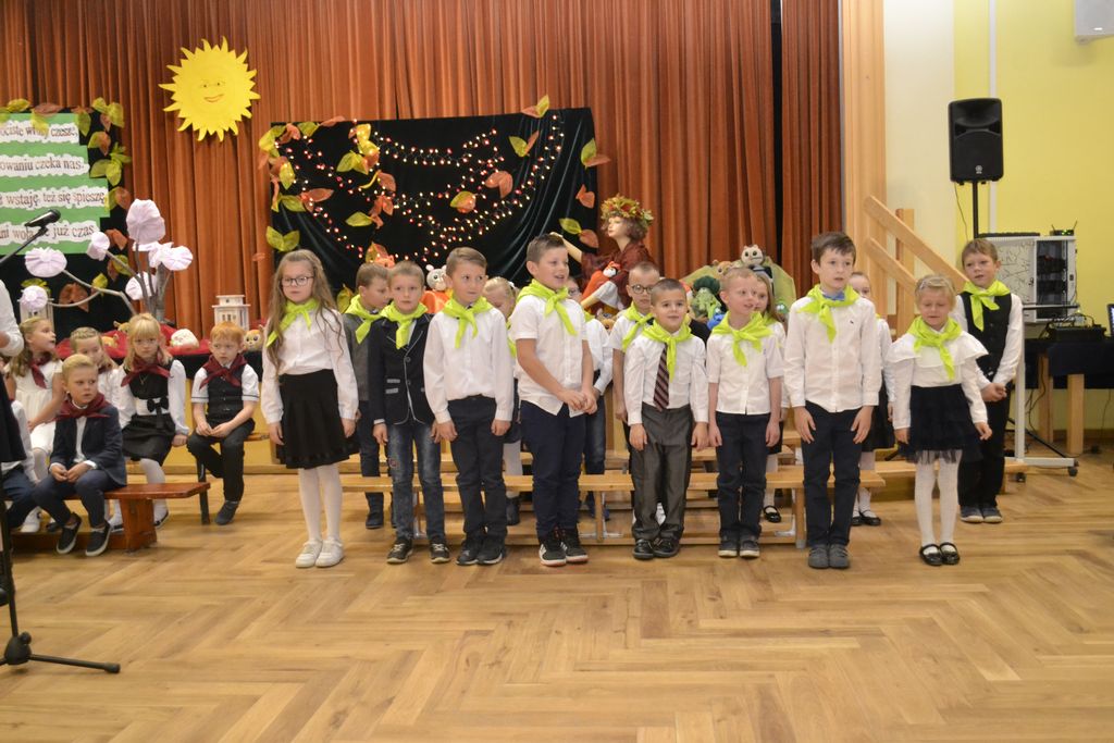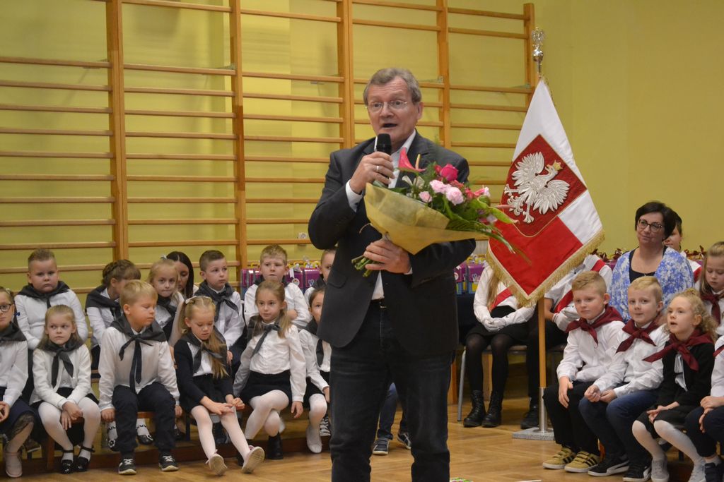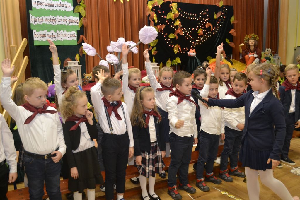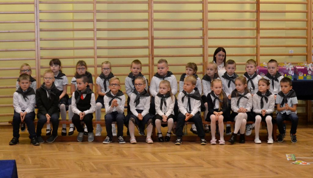 Prowadzące, Natasza Chałabiś i Lena Jaworska,  przedstawiły wszystkich  uczniów klas pierwszych wraz z ich wychowawczyniami: klasę 1a i panią Teresę Wójcik, klasę 1b i panią Lidię Troczyńską i panią Kamilę Stubę, klasę 1c i panią Paulinę Łukę oraz klasę 1d i panią Annę Muszyńską. Następnie głos zabrała pani dyrektor Danuta Buryta-Arndt, która  zwróciła się do pierwszaków z prośbą, by byli pilni w nauce i dobrze wypełniali swoje obowiązki, gdyż jest to klucz do sukcesu. Dyrektor szkoły zwróciła się także do rodziców podkreślając ich ogromna rolę we wspieraniu dzieci w zdobywaniu wiedzy, poświęcaniu im czasu i zachęciła do wielopłaszczyznowej współpracy z dyrekcją i nauczycielami. Uczniowie klas pierwszych wzorowo zdali egzamin na ucznia klasy pierwszej, odpowiadając na pytania z zakresu matematyki, języka polskiego, bezpieczeństwa i przyrody. Zaprezentowali również wesołe piosenki. Występy dzieci oceniało jury: pani dyrektor Danuta Buryta-Arndt i pani Edyta Lipkowska. Każda klasa otrzymała najwyższy możliwy wynik  czyli 10 punktów! Najważniejszym momentem uroczystości było złożenie przez dzieci uroczystego ślubowania. Tekst przysięgi odczytała  pani wicedyrektor Małgorzata Dróbka-Jiers. Następnie odbyło się  pasowanie na uczniów, którego dokonały pani dyrektor Danuta Buryta-Arndt i pani wicedyrektor Małgorzata Dróbka-Jiers. W ten sposób pierwszoklasiści zostali oficjalnie włączeni do grona uczniów Szkoły Podstawowej im. Powstańców Wielkopolskich w Wyrzysku.