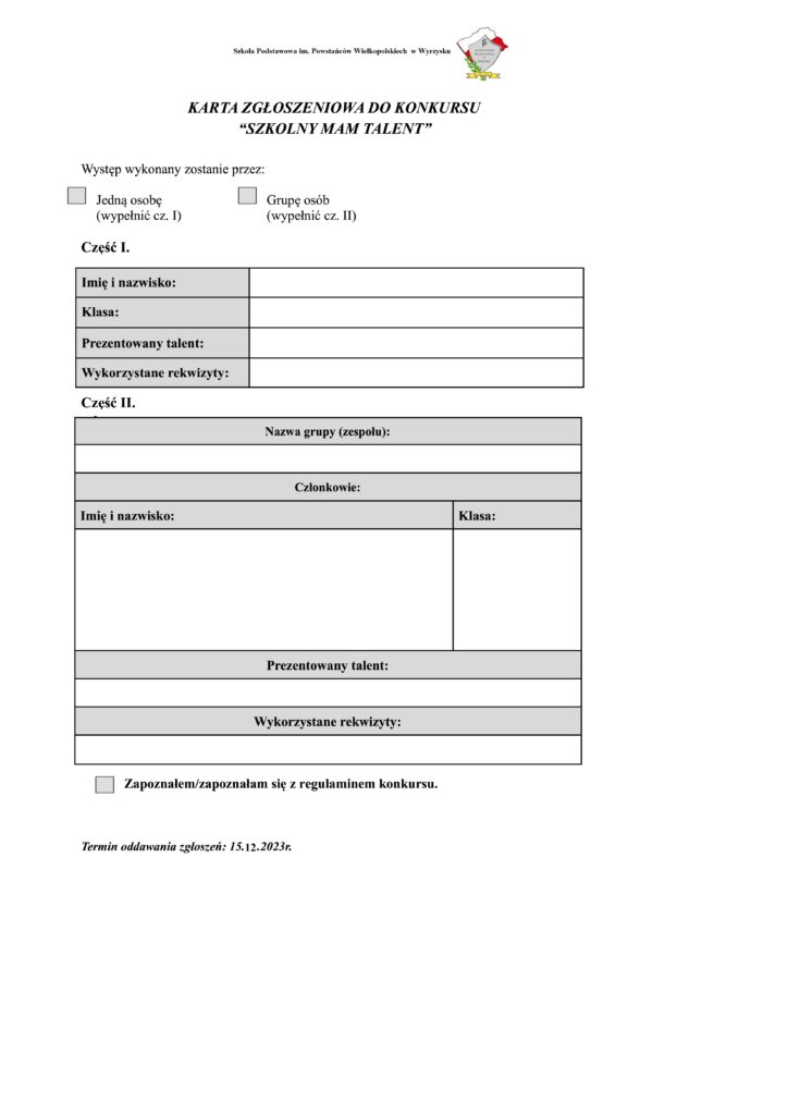 - Do udziału zaproszeni są zarówno wykonawcy indywidualni, jak i grupy prezentujące swój talent. Dopuszcza się udział w prezentacji całej klasy.
