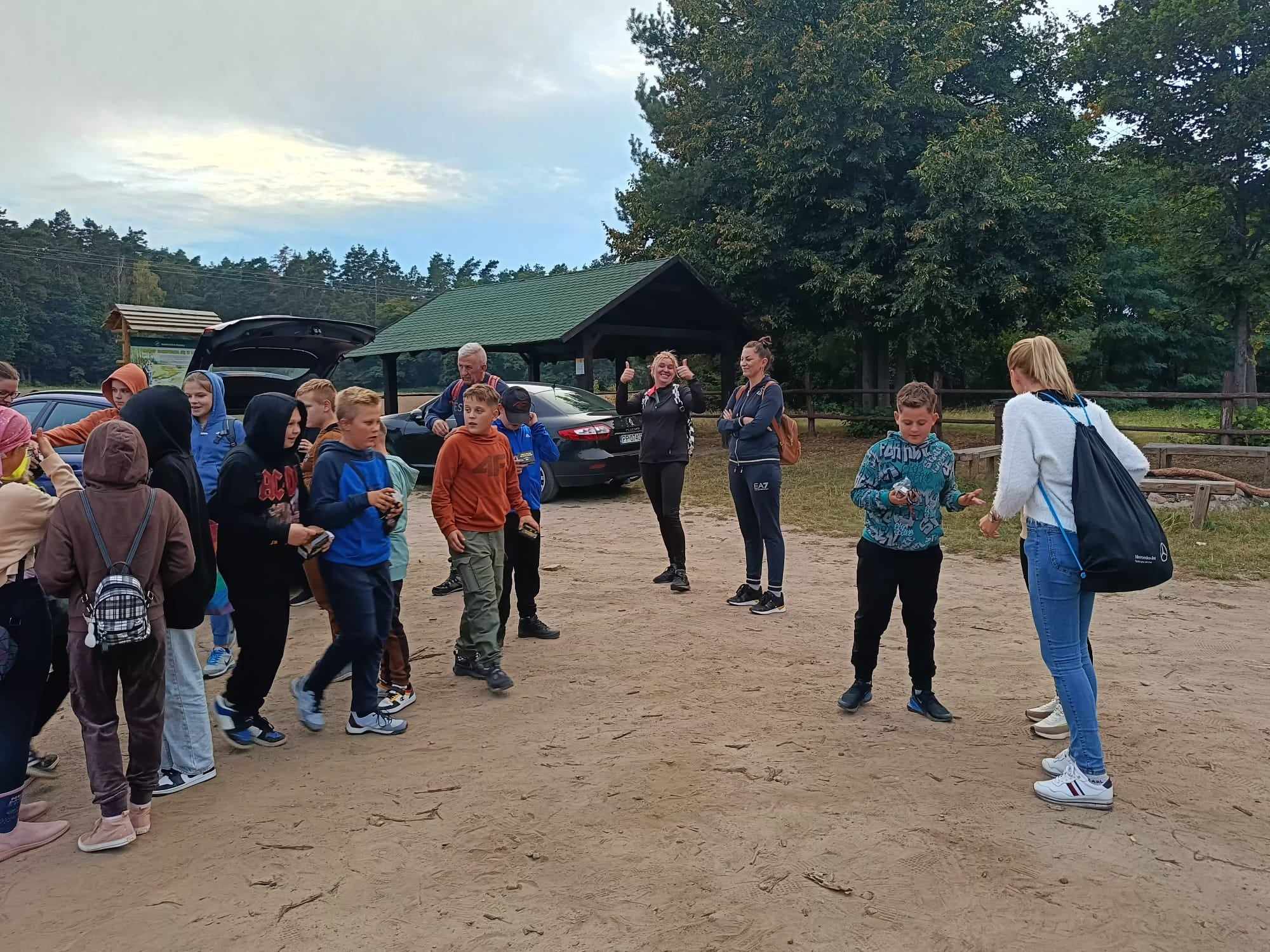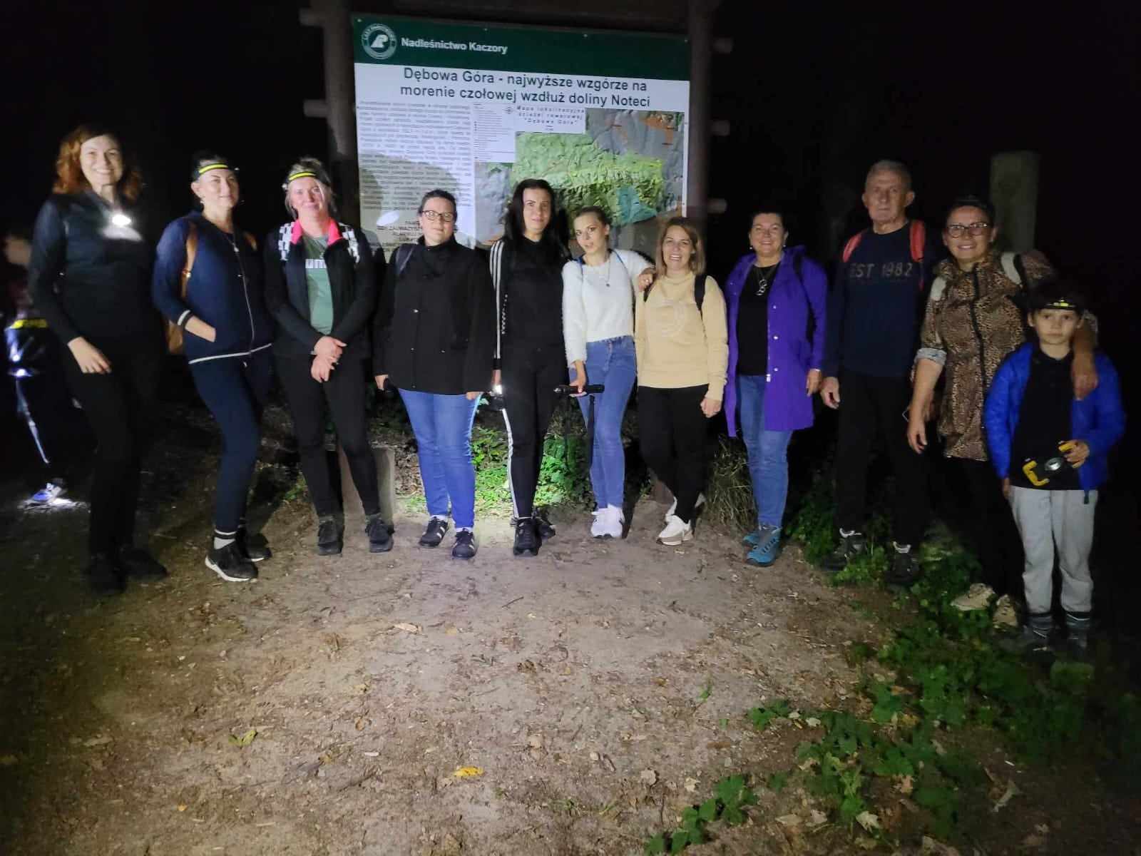 W piątek (28.09.2023r.) spotkaliśmy się o 18:00 na parkingu pod Dębową Górą w Polanowie. Przybyli prawie wszyscy uczniowie klasy 5a wraz z rodzicami. Na początku dziewczynki złożyły życzenia chłopcom i podarowały im super ledowe lampki czołowe, które tematycznie związane były z niespodzianką czyli nocnym wejściem na Dębową Górę. Zanim zaczęliśmy wspinaczkę zasady poruszania po lesie omówiła pani Dominika Żmijewska, która była naszym przewodnikiem tego wieczoru. Pełni emocji i ciekawości ruszyliśmy na wyprawę. Rodzice dźwigali na plecach słodkości (pachnące drożdżówki, rogaliki, eklerki,…) i napoje , a uczniowie „brykali” po lesie, bo komary nie odpuszczały. Kiedy dotarliśmy na sam szczyt (193m n.p.m.) było już całkiem ciemno i zaczęła się zabawa. Rodzice odpoczywali, a dzieciaki świetnie się bawiły, penetrując w ciemności las. Było wiele śmiechu i ciekawych opowieści, bo las w nocy jest trochę „straszny”. Na górze zrobiliśmy sobie jeszcze pamiątkowe zdjęcie i ruszyliśmy w dół, w stronę parkingu. Pogoda nam dopisała, choć pod koniec spaceru delikatnie zaczął podać deszcz, ale on nas tylko delikatnie ochłodził….