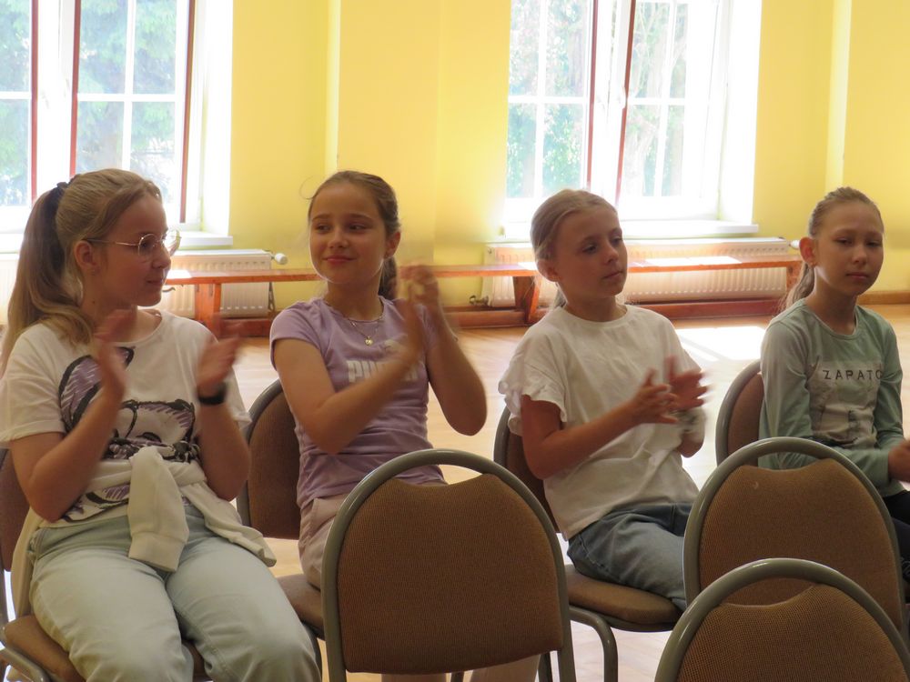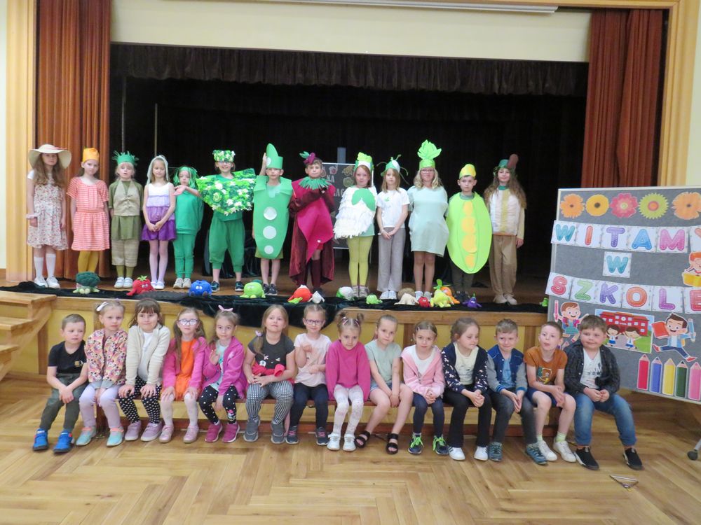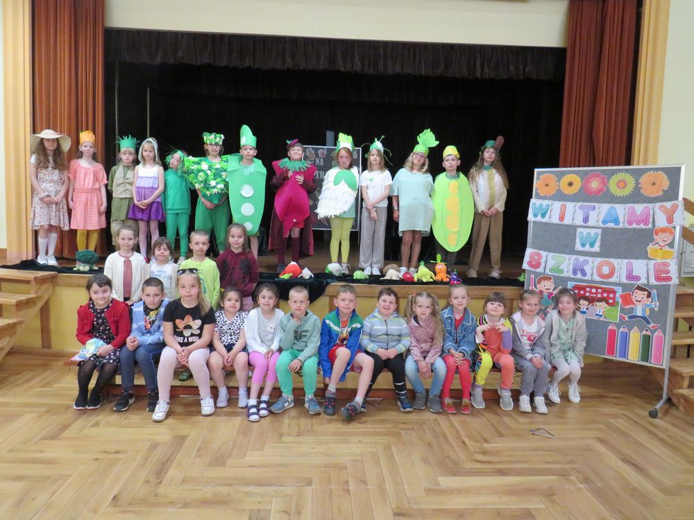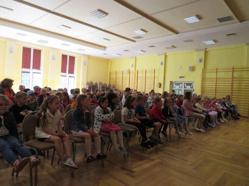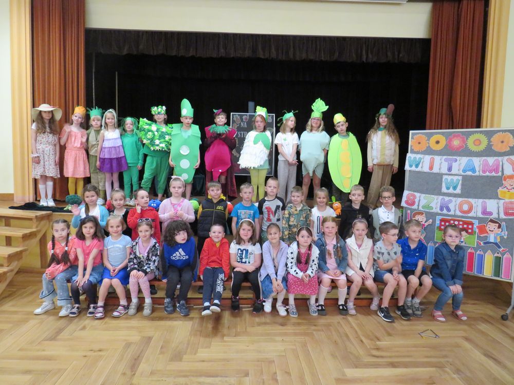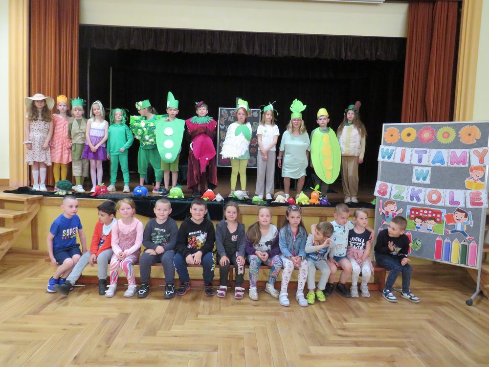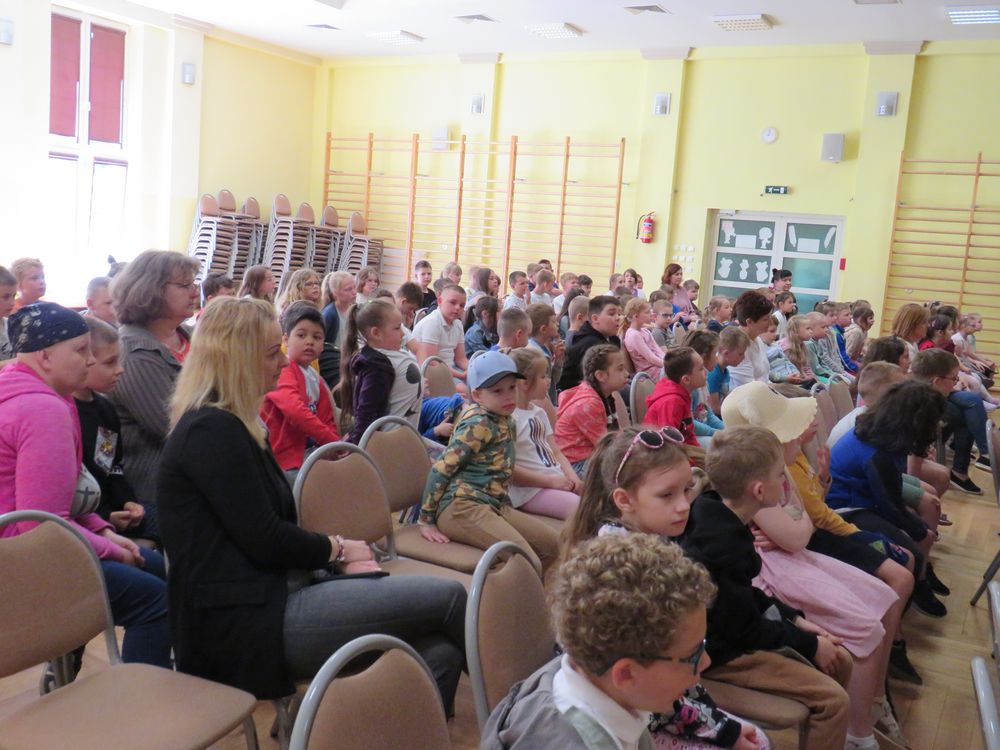 Grupa uczniów wraz z wychowawcami powitała przedszkolaków w sali widowiskowej. Spotkanie rozpoczęła wicedyrektor p. Małgorzata Dróbka- Jiers, przybliżając przedszkolakom tytułową postać z bajki „Dyzio Marzyciel”. Następnie uczniowie z Kółka Teatralnego przedstawili w bardzo ciekawy sposób inscenizację wiersza „Na straganie”. Uwagę widzów przykuwały również ich piękne stroje. Z kolei klasa II b wykonała utwór muzyczny na instrumentach perkusyjnych. Miło było patrzeć na skoncentrowane buzie słuchaczy.