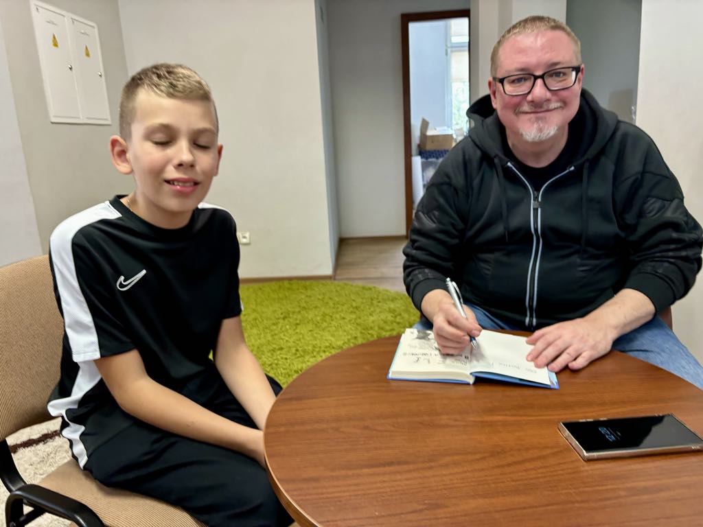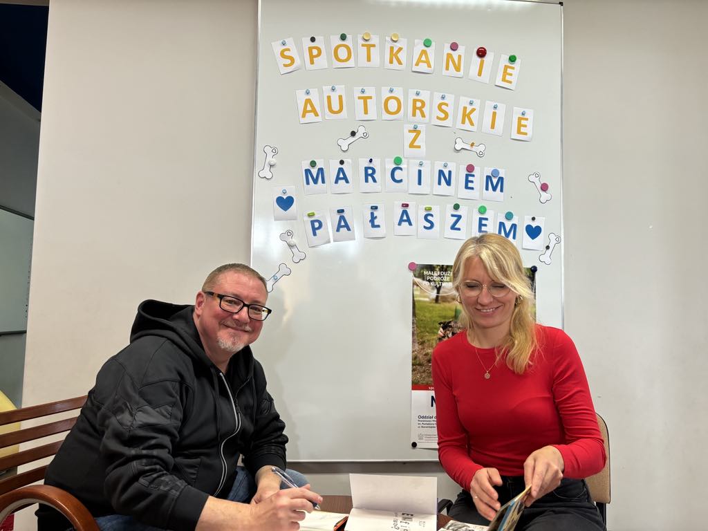 Marcin Pałasz okazał się być pełen pozytywnej energii i dobrego humoru,  którymi szczodrze obdzielał czytelników swoich opowieści o niesfornym, za to sympatycznym psie Elfie. Sam Elf doczekał się już wydania siedmiu książek o nim, a niebawem ukaże się ósmy tom.  Autor uchylił też rąbka tajemnicy, która stanowi hit dla wszystkich elfomaniaków:  możemy spodziewać się ekranizacji przygód czworonożnego bohatera! Póki co uczestnicy spotkania ucieszyli się z możliwości otrzymania autografu pisarza i pamiątkowych fotografii.