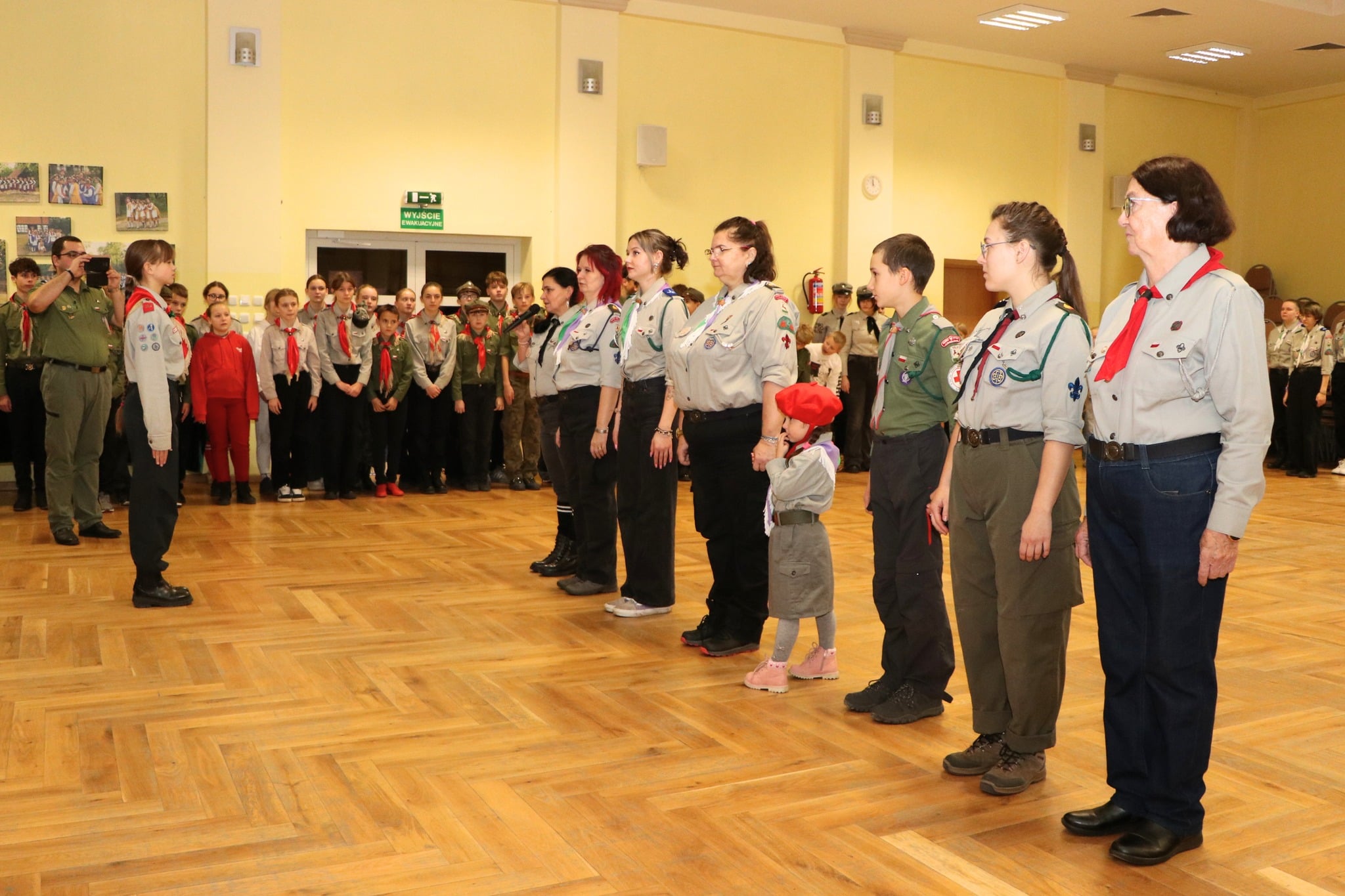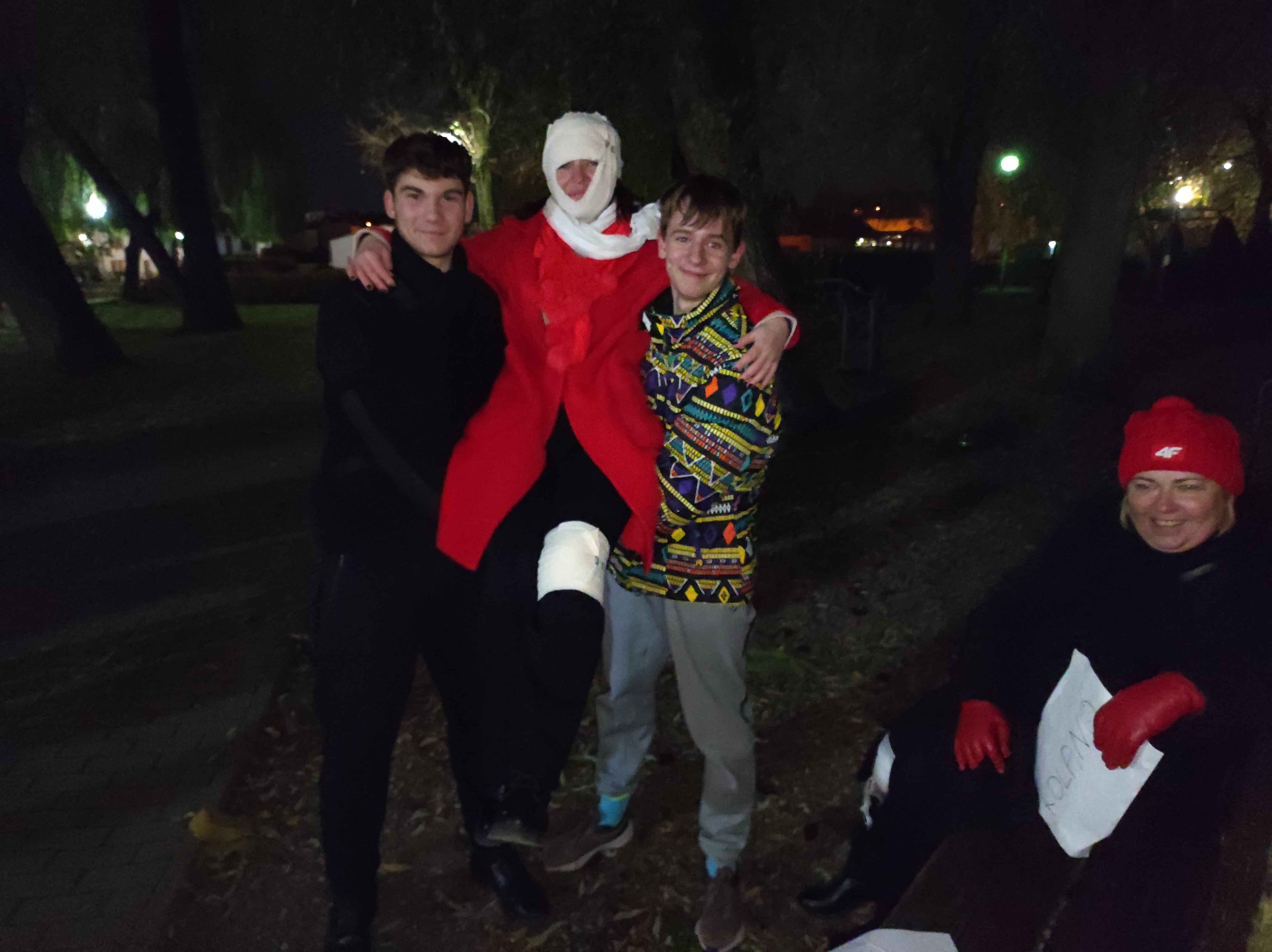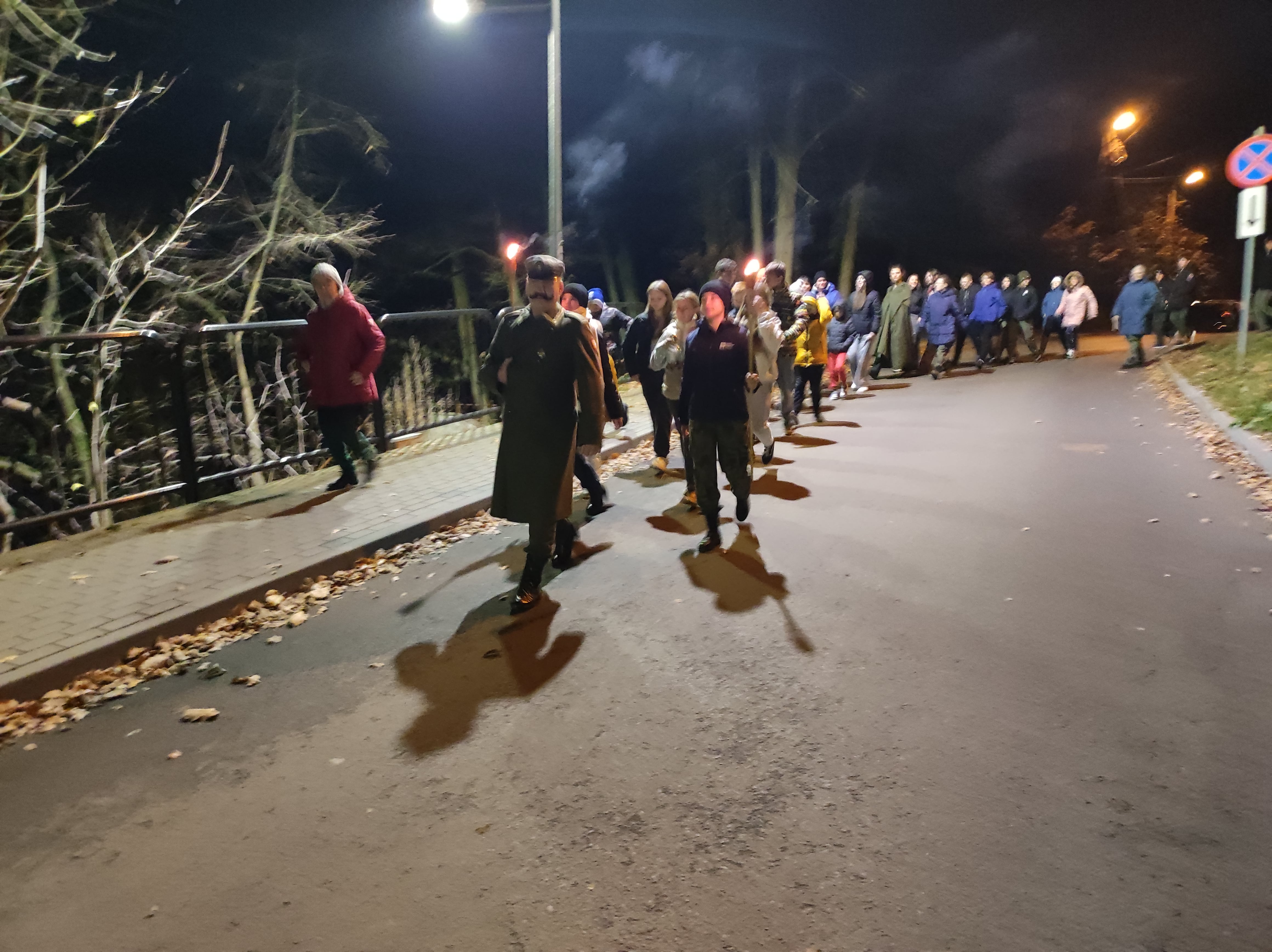 Po wieczornicy i pysznej kolacji nadszedł czas na integrację harcerskiego środowiska. Przedstawiciele wszystkich drużyn ponownie spotkali się w sali widowiskowej, by wymienić się doświadczeniem w zabawach i pląsach, nawiązać nowe relacje, a także podtrzymać te już nawiązane. Ze względu na późną porę spotkanie nie było  zbyt długie, ale trzeba przyznać, bardzo intensywne. Około 22.15 wszyscy udali się na nocny odpoczynek. Nie wiedzieli jednak, że to jeszcze nie koniec niespodzianek, bowiem około godziny 23:15 przybył po nich sam marszałek Józef Piłsudski, który poprowadził cały zastęp harcowników pod pomnik pomordowanych wyrzyszczan w celu zapalenia  zniczy i oddania hołdu poległym. Jednakże zanim rodzina harcerzy dotarła do tego miejsca, musiała wykonać dodatkowe zadania, tym razem przygotowane przez kreatywnych rodziców wyrzyskich harcerzy. Trzeba było na przykład dopowiedzieć słowa wiersza, zaśpiewać patriotyczną piosenkę lub wypić miksturę nieśmiertelności, czy opatrzyć rannych, którzy doznali obrażeń  w wyniku stoczonego z wrogiem boju. Ze wszystkimi zadaniami harcerska rodzina poradziła sobie sprawnie i poprawnie. Nadmienić również należy, że  dla niektórych uczestników była to noc szczególna i wyjątkowa, bowiem około godziny 24.00 przy ww. pomniku odbyło się zaprzysiężenie nowych członków ZHP, którzy swoją działalnością zasilą drużyny, w tym także drużynę „Sokołów” z Wyrzyska. Po przyrzeczeniu wszyscy skierowali się do odwrotu w kierunku szkoły, a po dotarciu udali się na nocny wypoczynek.