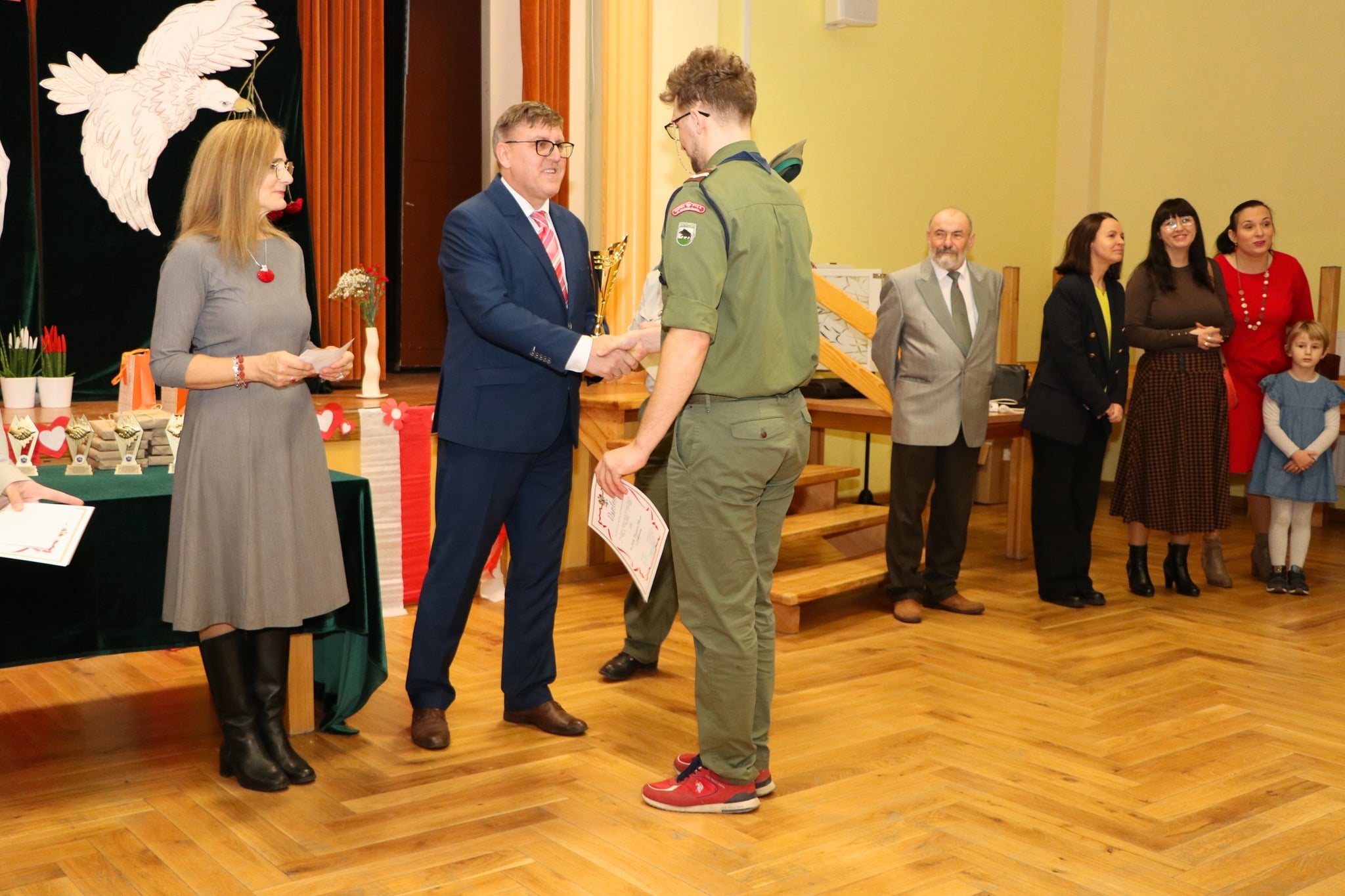Zaraz po posiłku druhny i druhowie zabrali się za wykonanie kolejnego zadania. Tym razem odbyło się ono w pomieszczeniu i polegało na przygotowaniu plakatu. Zarówno z samym rajdem jak i z wykonaniem plakatu drużyny poradziły sobie rewelacyjnie. Nie stanowiło to jednak zakończenia zadań, bowiem wieczorem wszystkie harcerki i wszyscy harcerze spotkali się na wieczorze poezji patriotycznej perfekcyjnie przygotowanym przez gospodarzy całej imprezy. To oni dostarczyli zebranym w sali widowiskowej gościom i pozostałym przybyłym refleksji, zadumy i zachwytu nad słowem pisanym i śpiewanym. Recytując tematyczne  wiersze i śpiewając piosenki, harcerze z wyrzyskiej drużyny wprowadzili wszystkich w patriotyczny nastrój.