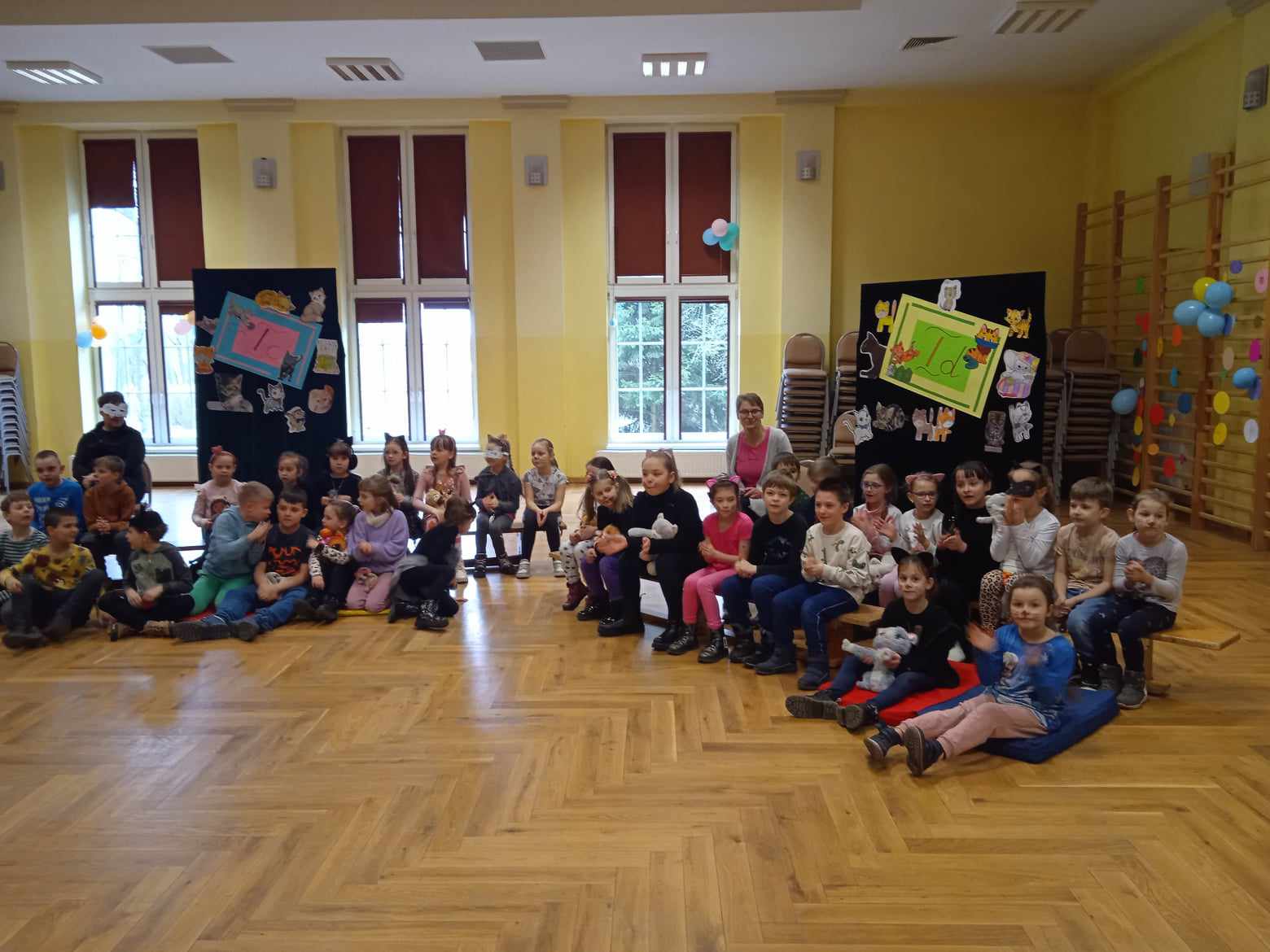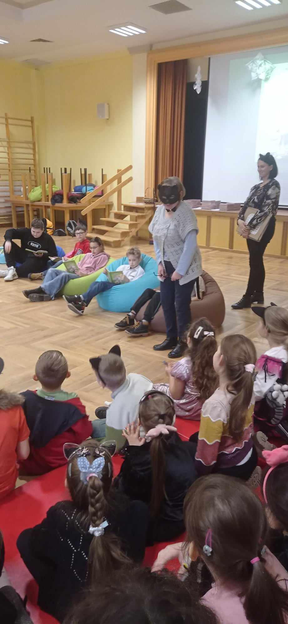 Początek drugiego półrocza to tradycyjnie w naszej szkole czas uroczystości bibliotecznej, podczas której najmłodsi uczniowie stają się pełnoprawnymi czytelnikami. Spotkanie, które miało miejsce w naszej sali widowiskowej 2 lutego, było utrzymane w kocich motywach, gdyż do czytania dla pierwszoklasistów wybrałyśmy zabawny tekst Waldemara Cichonia pt. „Cukierku, ty łobuzie!”.