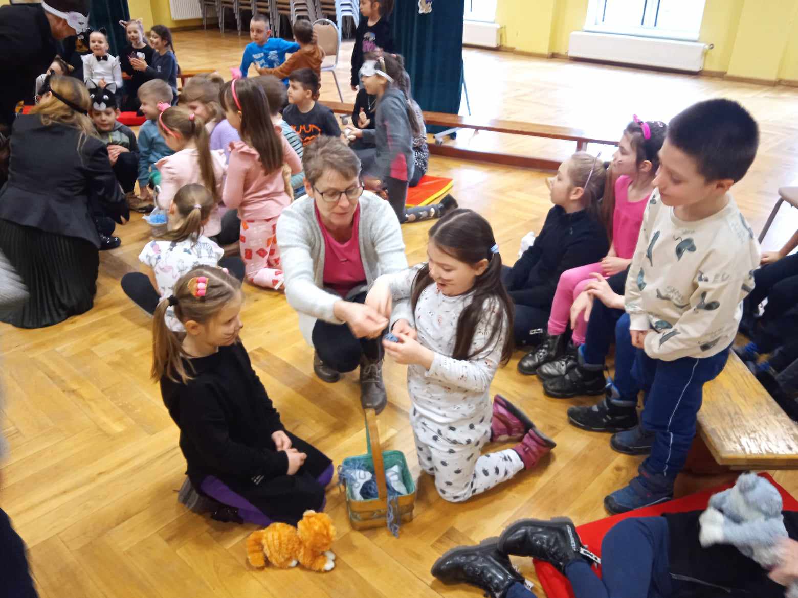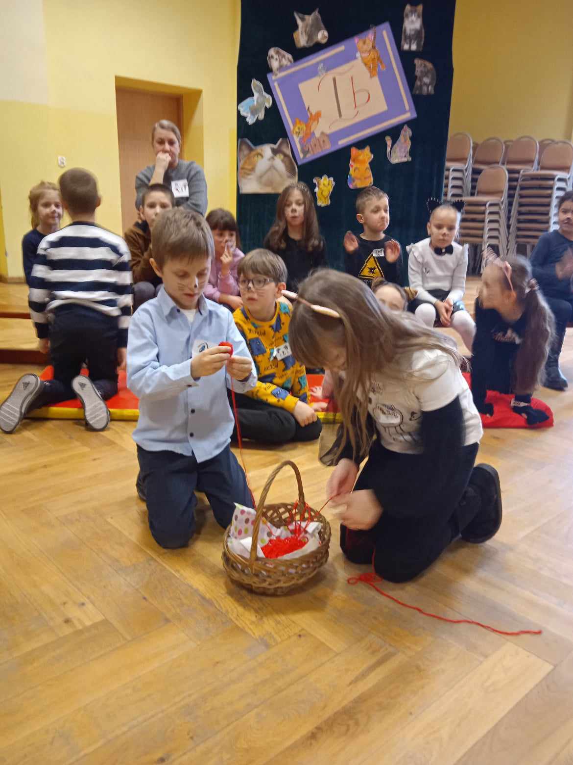 o Cukierku. Niegdyś rycerza pasowano przy użyciu miecza, zaś nasi pierwszoklasiści stawali się czytelnikami za dotknięciem magicznej miotły! Musimy z radością przyznać, że wielu uczestników spotkania – tych młodszych, ale i starszych – było wyposażonych w kocie atrybuty – wąsy, ogon, uszy, futro! Nawet pani dyrektor – Danuta Buryta-Arndt, która dokonała uroczystego pasowania na czytelnika Szkoły Podstawowej im. Powstańców Wielkopolskich w Wyrzysku, nie zapomniała o kocich elementach stroju. W czasie pasowania nie zabrakło też odpowiedniej muzyki (któż z nas nie zna motywu z „Różowej Pantery”), zabaw z kłębkiem wełny (w zwijaniu na czas mistrzem okazała się klasa I b), a także kociej gimnastyki (tu świetnym instruktorem okazał się Czarek z klasy szóstej). Na koniec na każdego ucznia klasy pierwszej czekały pamiątkowe dyplomy, cukierki, a także książki pt. „Wnuczka antykwariusza” autorstwa Justyny Bednarek. Tę pięknie ilustrowaną opowieść każdy pierwszoklasista otrzymał w ramach kampanii pn. „Mała książka – wielki człowiek”, którą już po raz szósty prowadzą Ministerstwo Kultury i Dziedzictwa Narodowego
