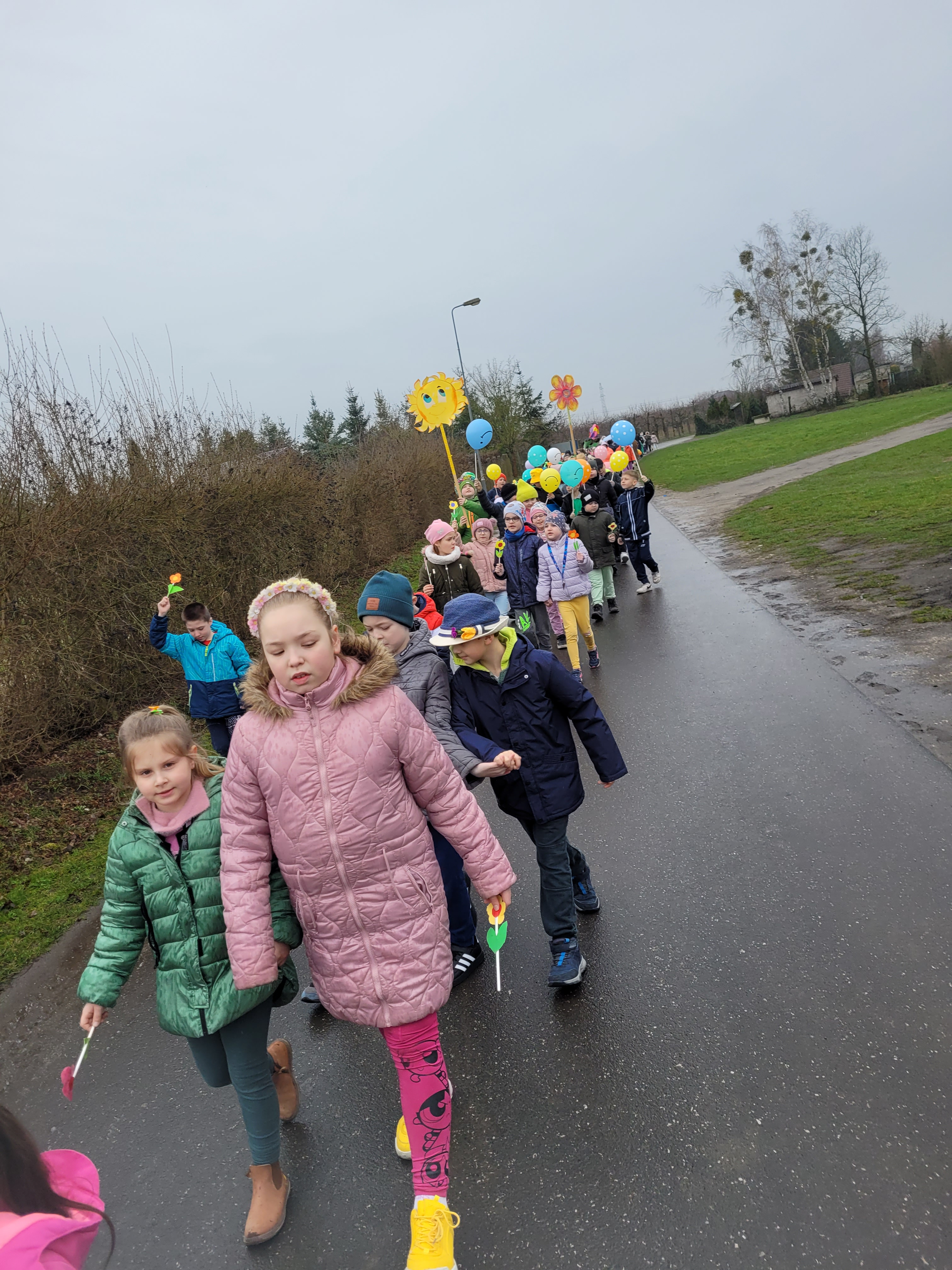 W polskich szkołach początek wiosny jest często celebrowany wyjściem w plener. W naszej szkole też tak było. Uczniowie klas I-III wraz z wychowawczyniami zgromadzili się o godzinie 9.00 na boisku szkolnym i stamtąd z kukłą Pani Wiosny na czele ruszył barwny pochód w stronę Rodzinnych Ogrodów Działkowych. Dzieci w trakcie przemarszu ochoczo śpiewały piosenki o tematyce wiosennej, robiły hałas własnoręcznie wykonanymi instrumentami perkusyjnymi i z uśmiechem na twarzy wołały: „Żegnaj, zimo! Witaj, wiosno!”