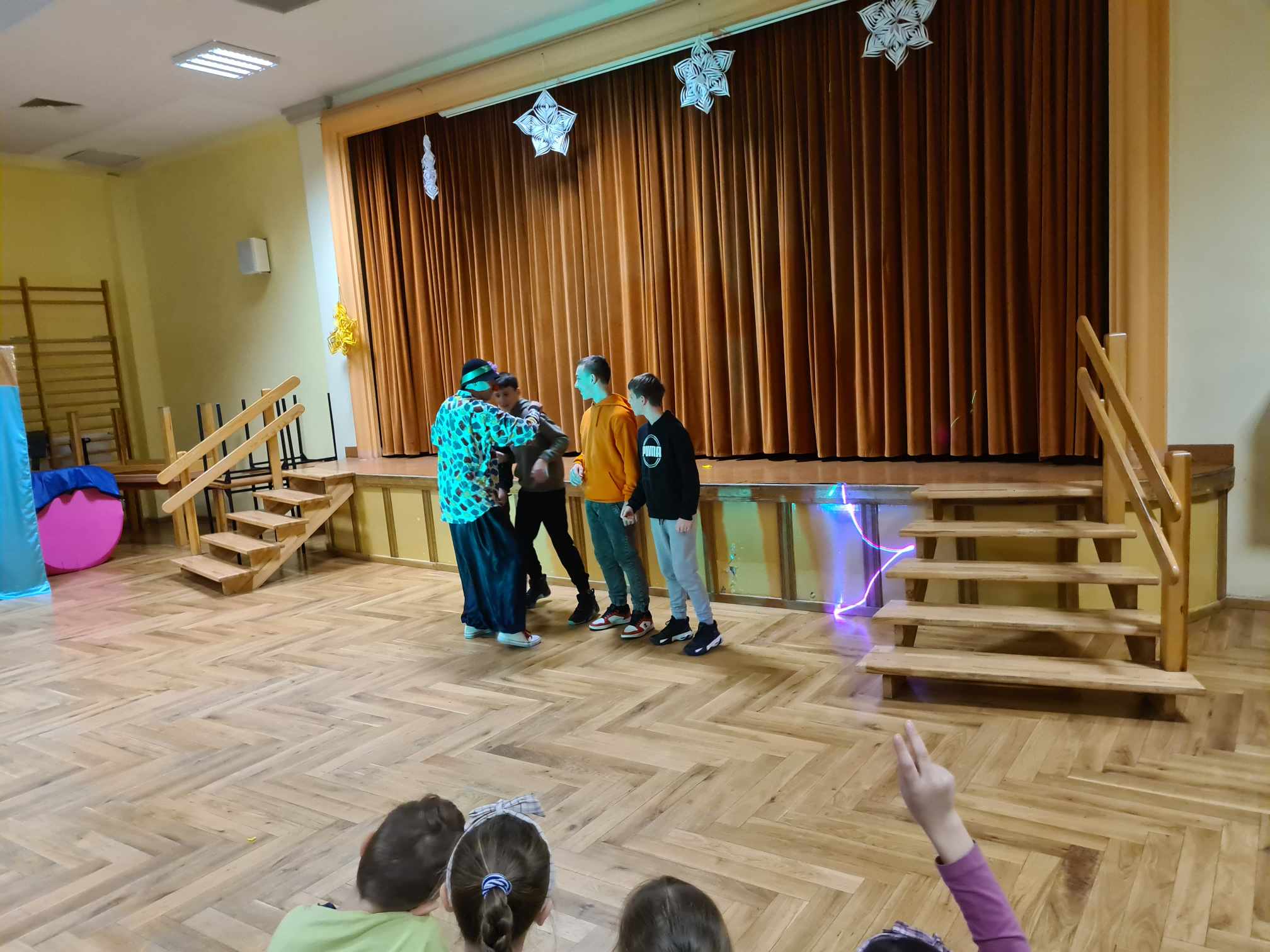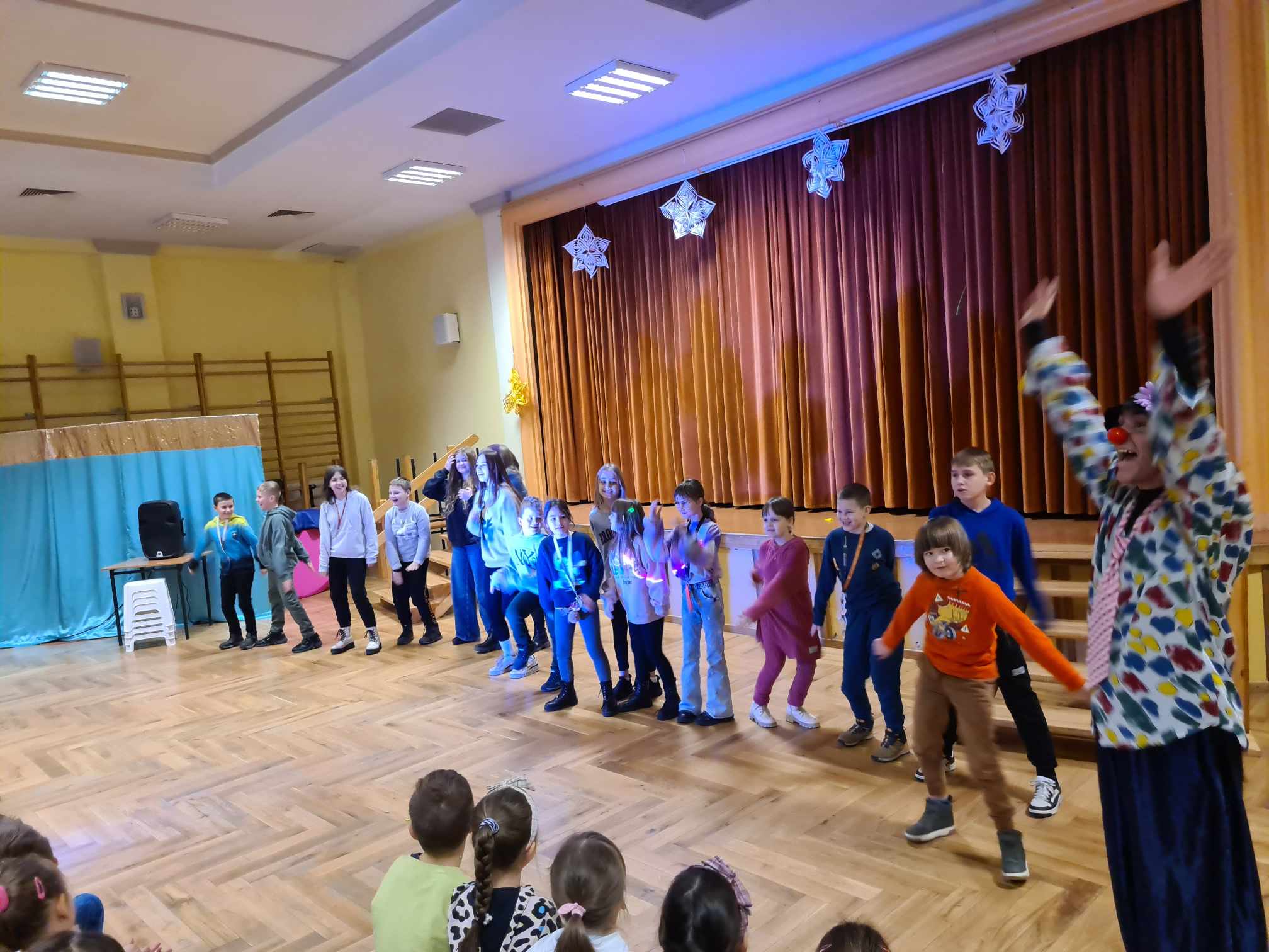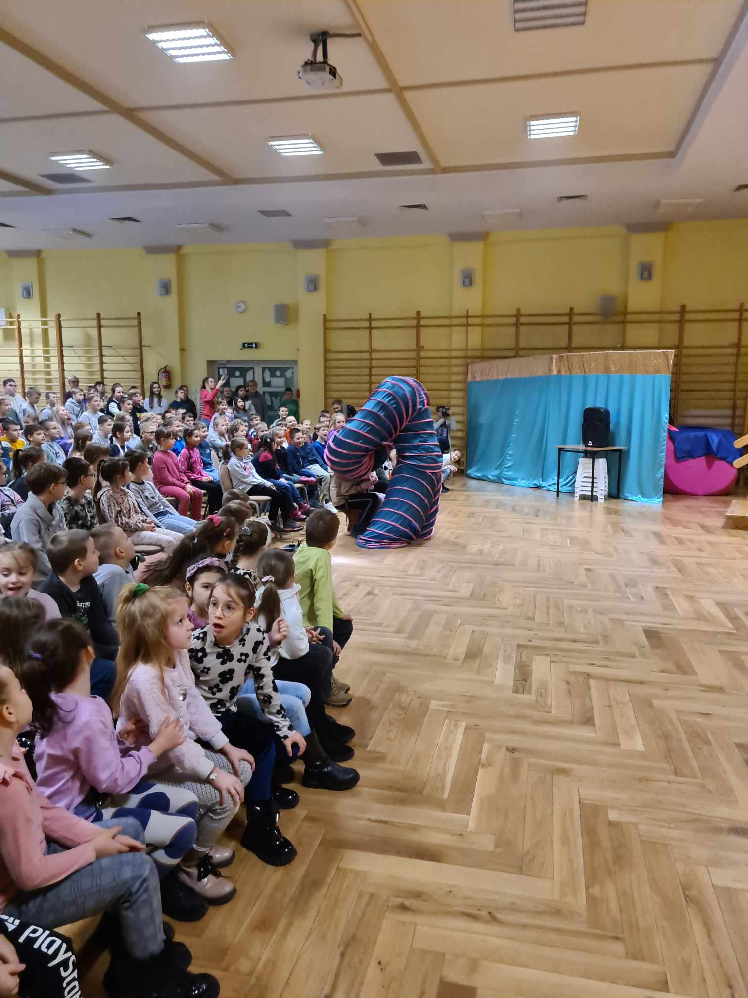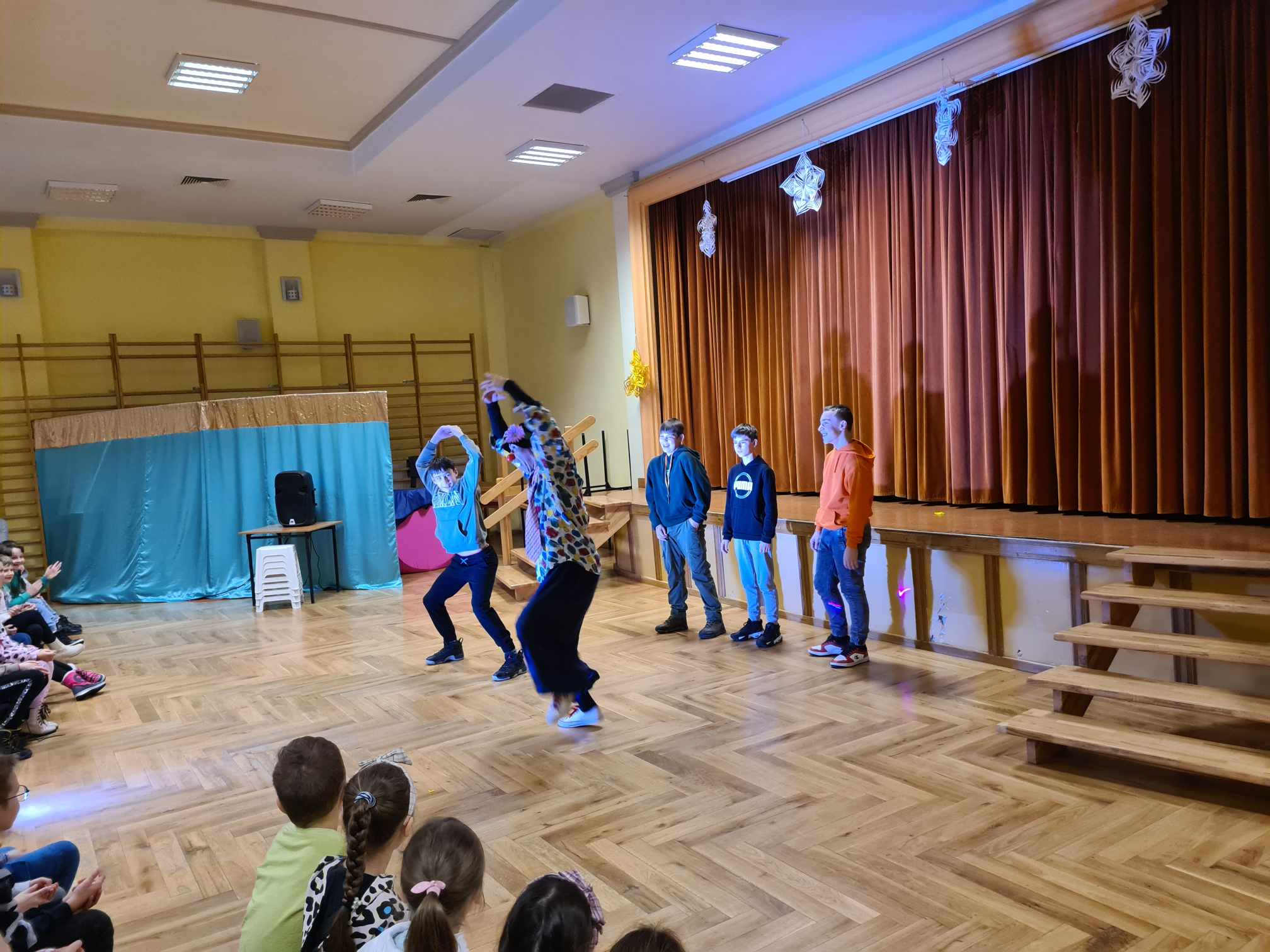 W gościnnych progach naszej placówki zagościli artyści z Rumunii, Ukrainy i Mołdawii, którzy uczestniczyli w międzynarodowych festiwalach i programach telewizyjnych np. w rumuńskiej wersji „Mam Talent”. Wystąpili: pomarańczowy zespół (wielkie lalki), piękna Jasmine w zabawnym tańcu, Różowa Pantera zamknięta w żywej kostce, klaun Igor, dziwny profesor z Niemiec i człowiek sprężyna, którego pokaz wywołał największy zachwyt publiczności. Uczniom podobało się to, iż choć na kilka chwil mogli stać się częścią przedstawienia, gdyż artyści włączali dzieci i młodzież do wspólnej zabawy. Pokazom towarzyszyła świetna muzyka, dym sceniczny i lasery.