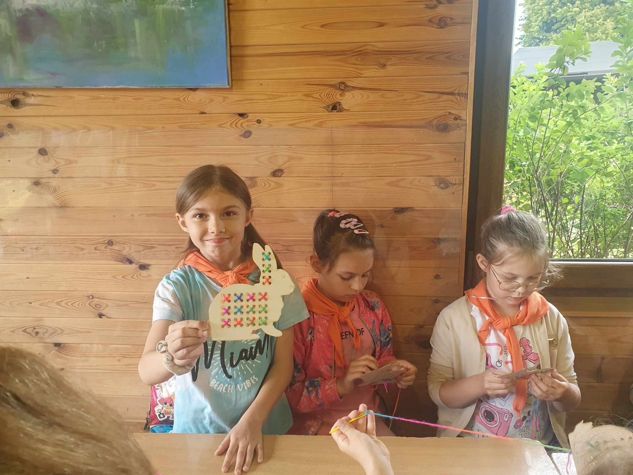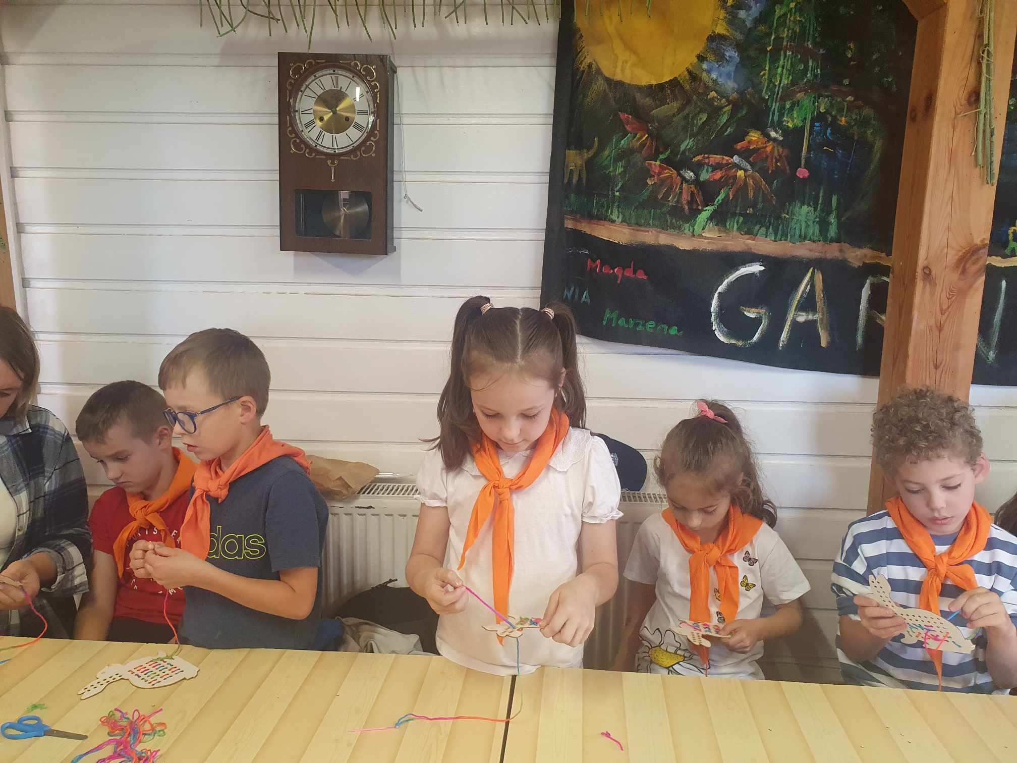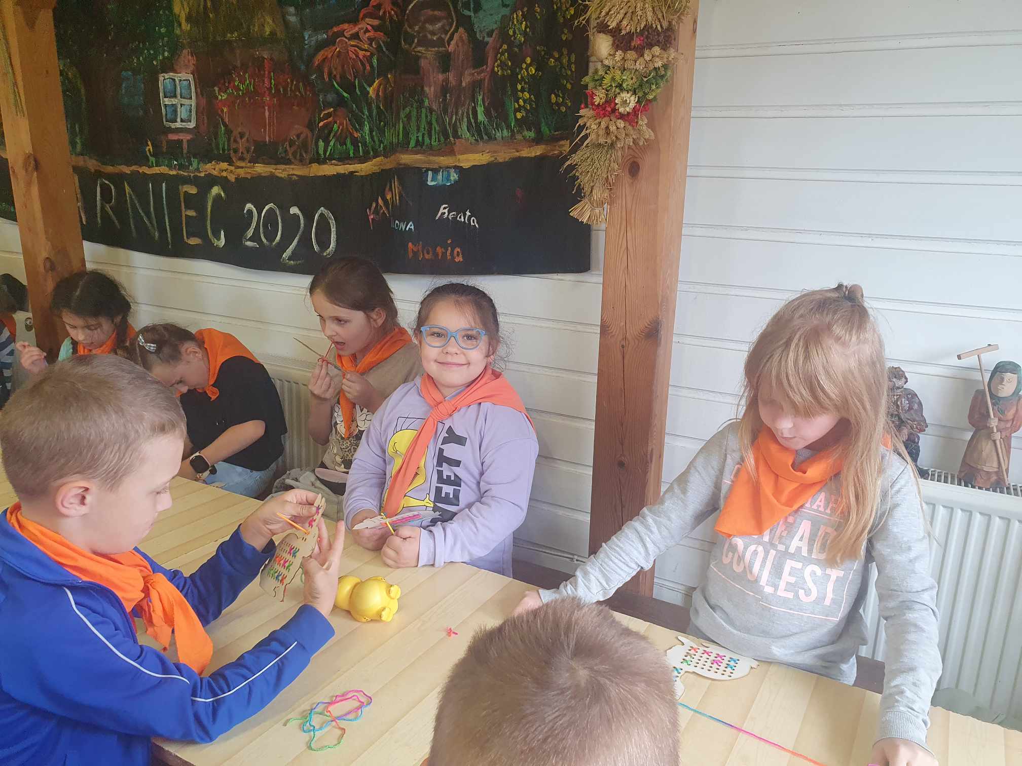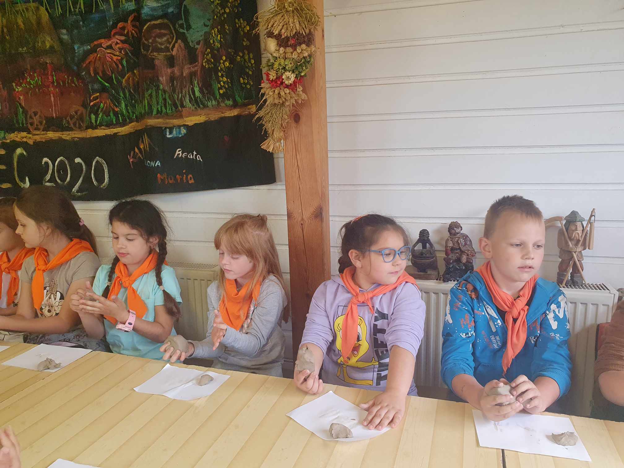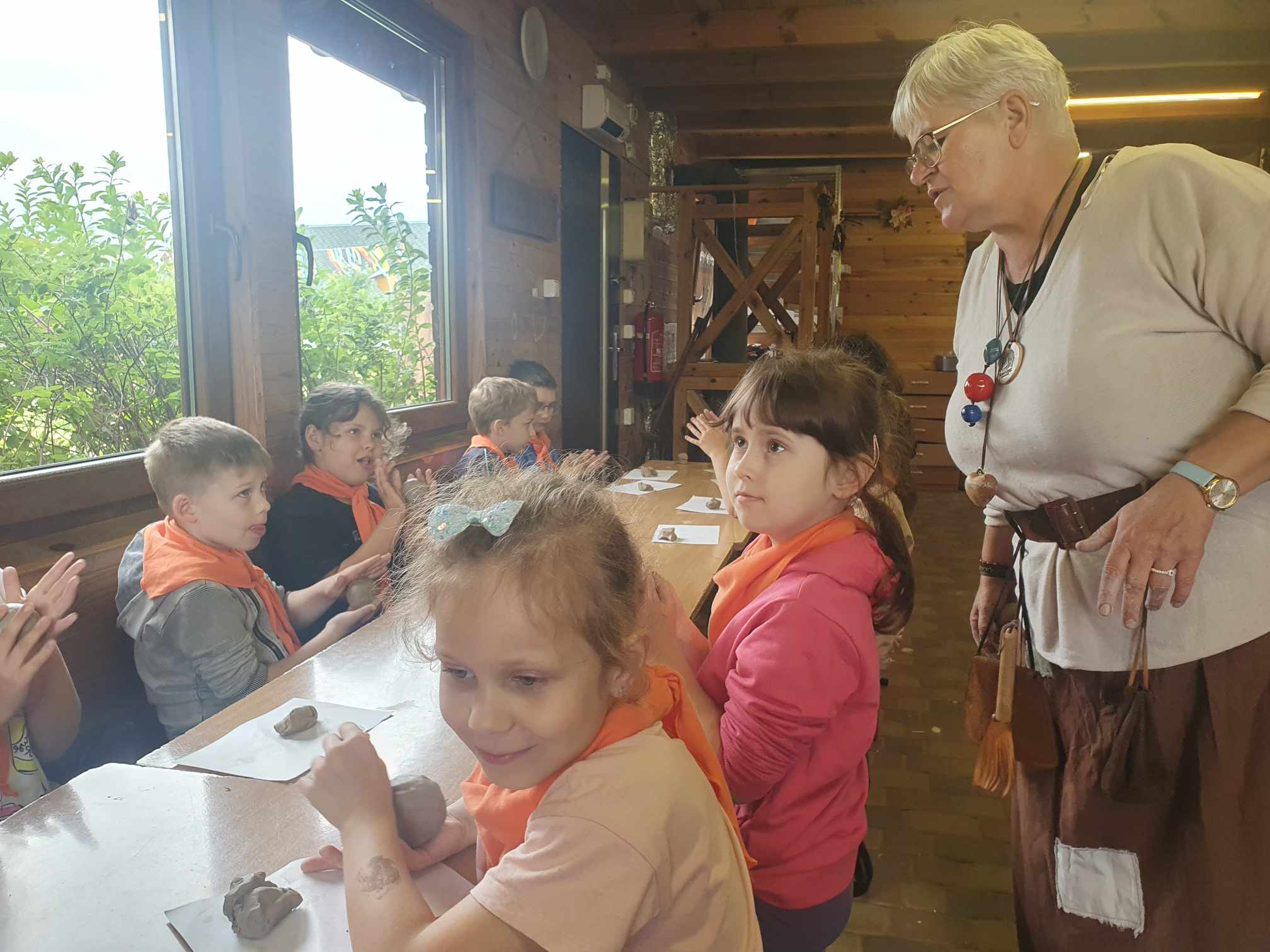 Następnie dzieci uczestniczyły w warsztatach rękodzielniczych: garncarstwo i igłą malowane. Zwiedzali i dotykali eksponaty w skansenie rzemiosła. Korzystali także z dodatkowych atrakcji, jak spotkanie z alpaką i alpako-terapeutą, udali się do sklepiku z oryginalnymi pamiątkami, które oczywiście zostały zakupione.