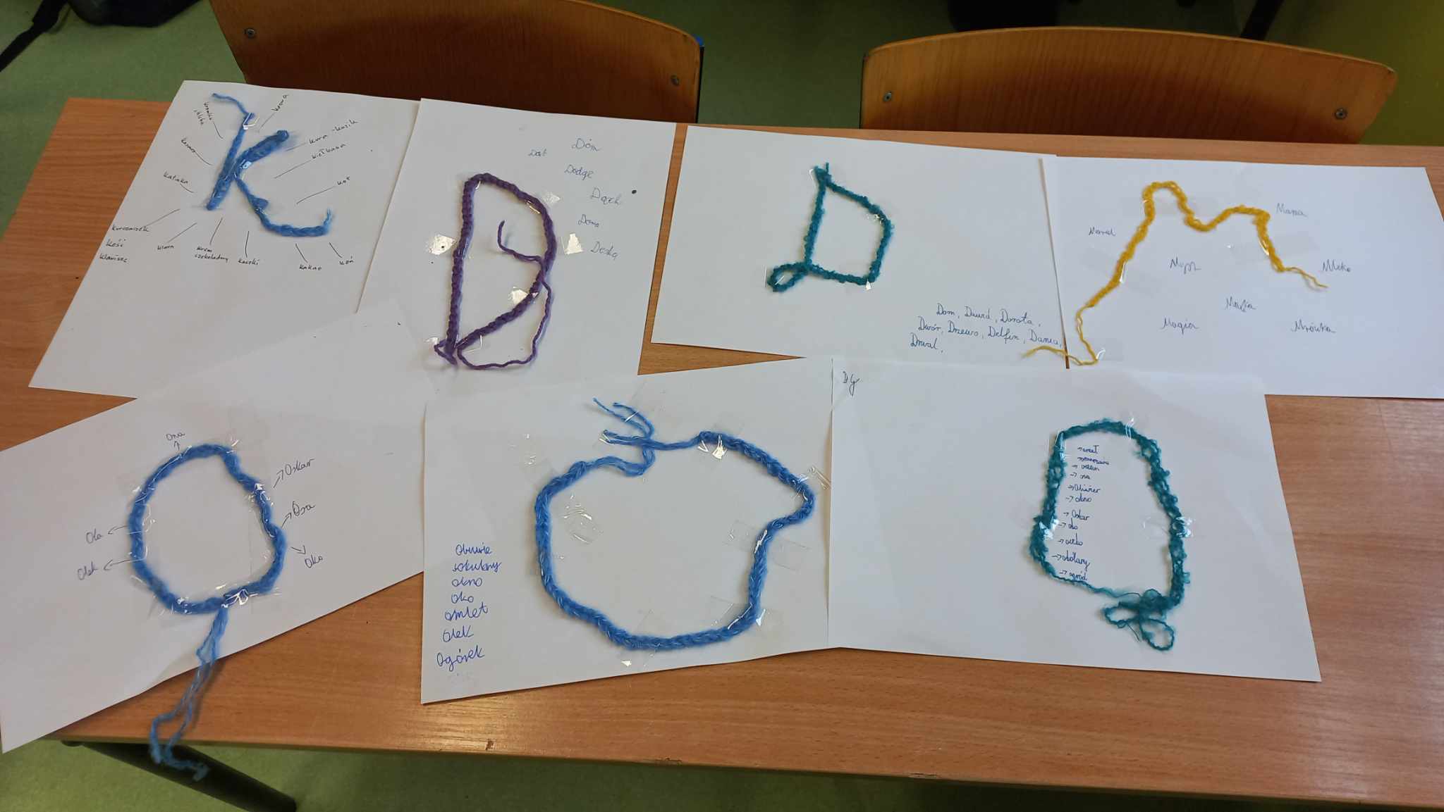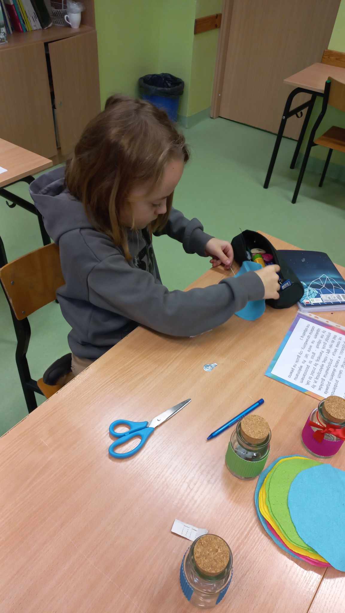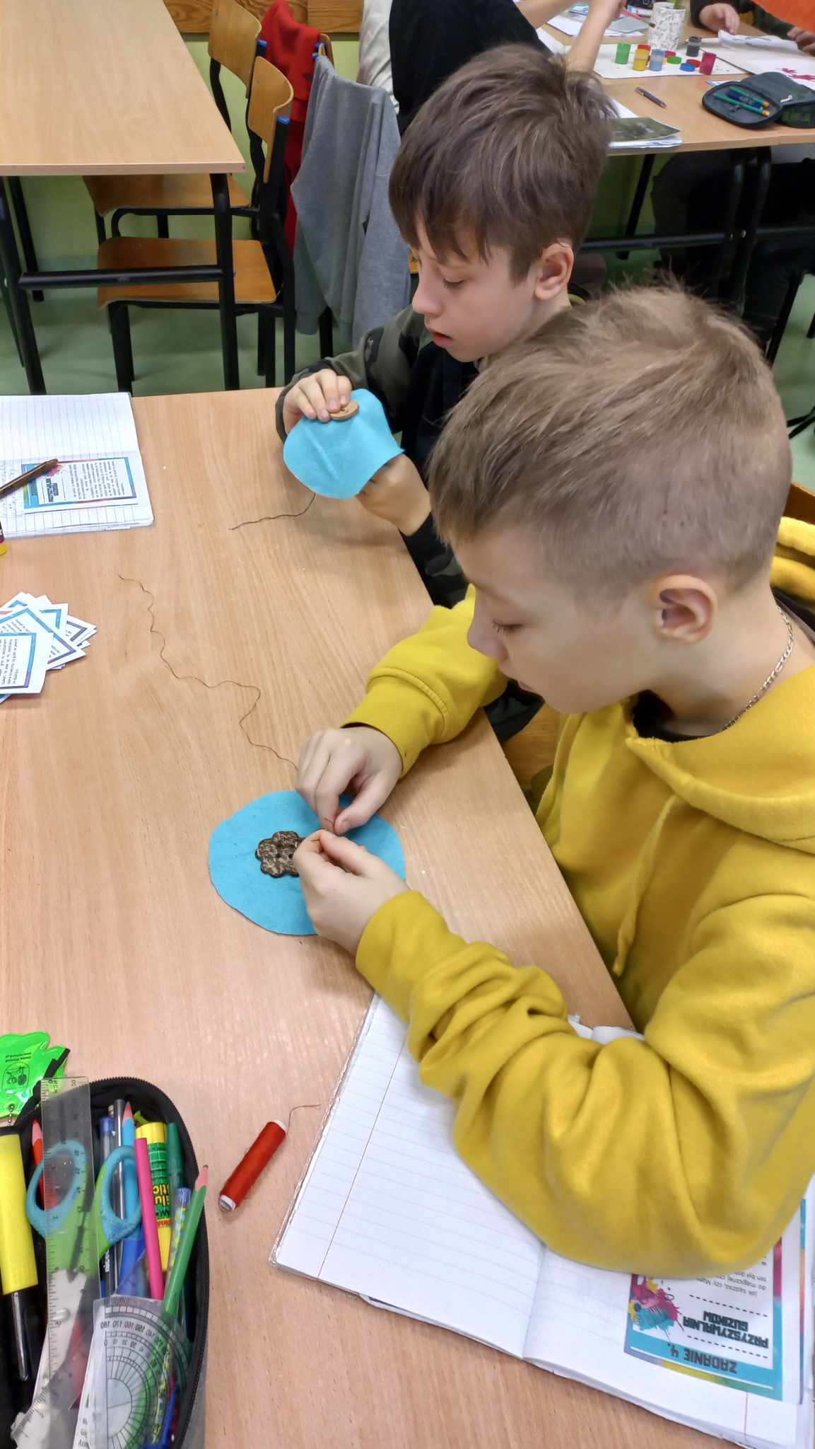 Odbyły się zajęcia z fleksografii – dzieci tworzyły niezwykłe, barwne obrazy i próbowały wierszem opisać to, co powstało. Inni uczniowie w tym czasie przyszywali guziki – okazało się, że to tylko z pozoru łatwa sztuka. Czasami igła trafiała nie w materiał, tylko w palec… Wśród zadań było również przędzenie liter – tutaj trzeba było najpierw wykonać łańcuszek z wełny na szydełku, a następnie uformować przędzę w kształt pierwszej litery swojego imienia, czyli inicjału. Dodatkowo należało zapisać jak najwięcej słów na konkretną literę. Kolejnym zdaniem bardzo pobudzającym wyobraźnię było „gotowanie”. Uczniowie musieli z nietypowych składników stworzyć recepturę (przepis) na potrawę, którą można by zaserwować w Akademii. Ostatnie zadanie, związane z wizytą w „rupieciarni”, polegało na wymyśleniu „niezwykłego” zastosowania dla „zwyczajnych” przedmiotów. Każdy uczeń musiał wybrać 2-3 rzeczy i nadać im nowe, fantastyczne przeznaczenie.