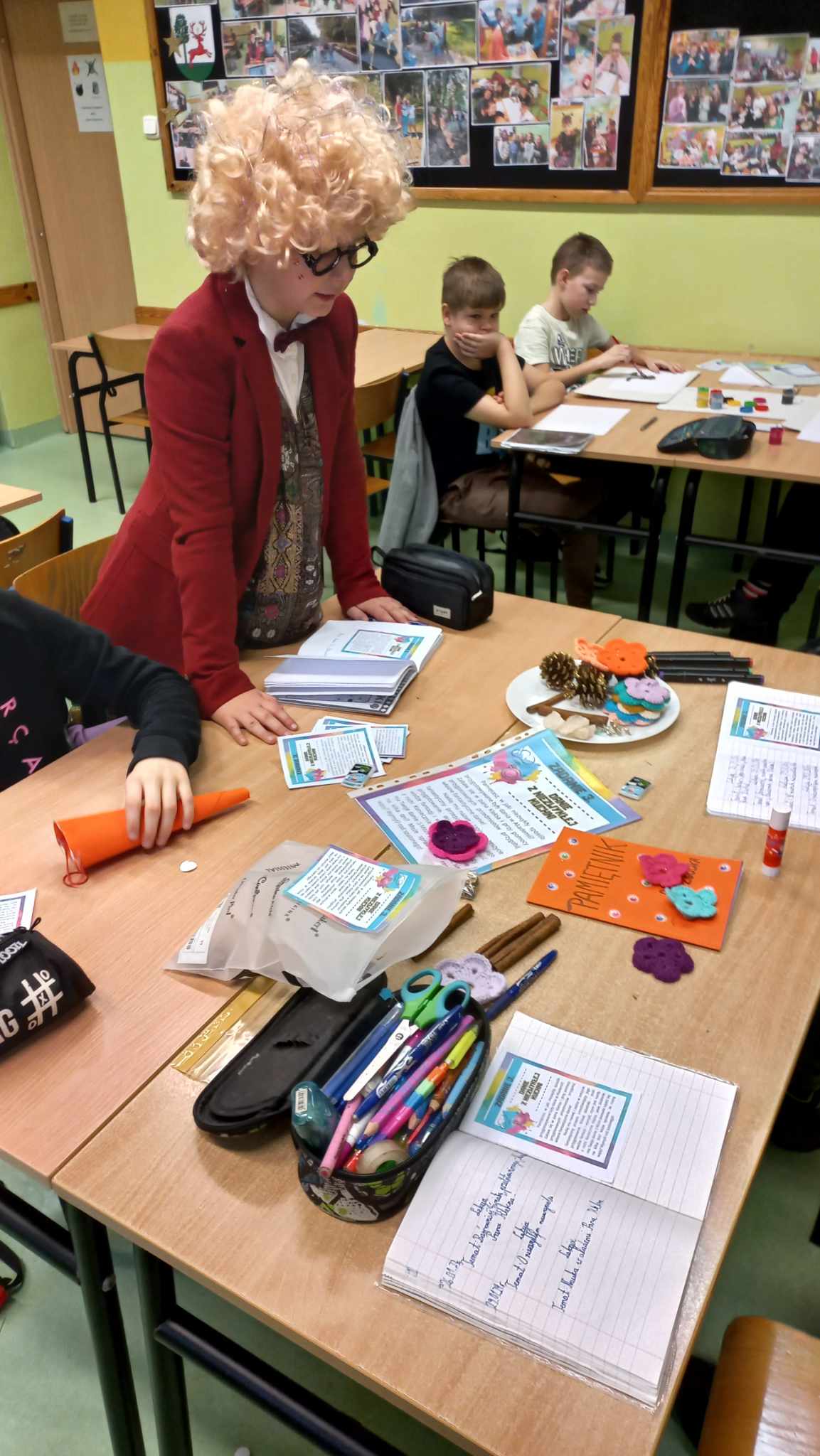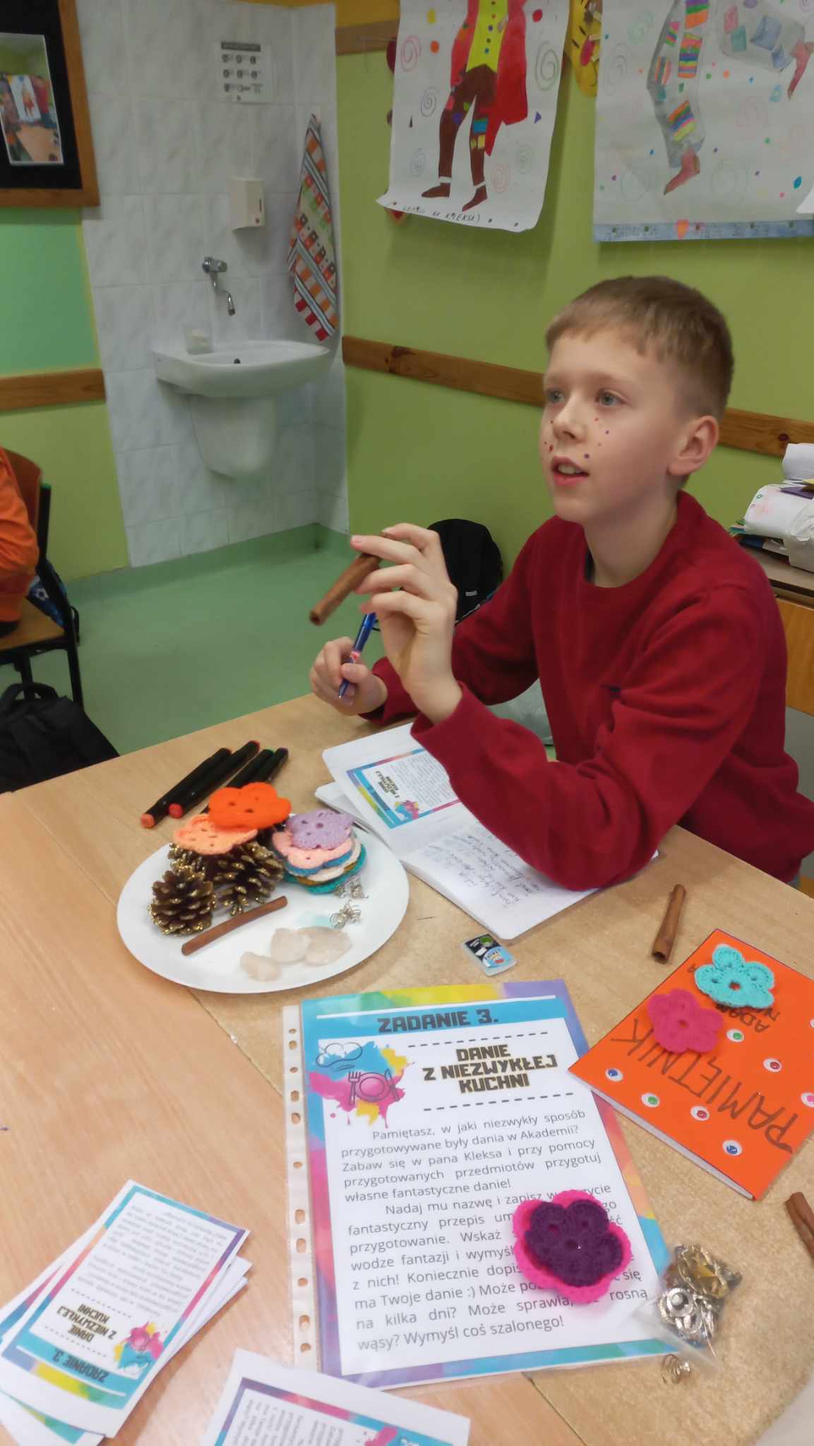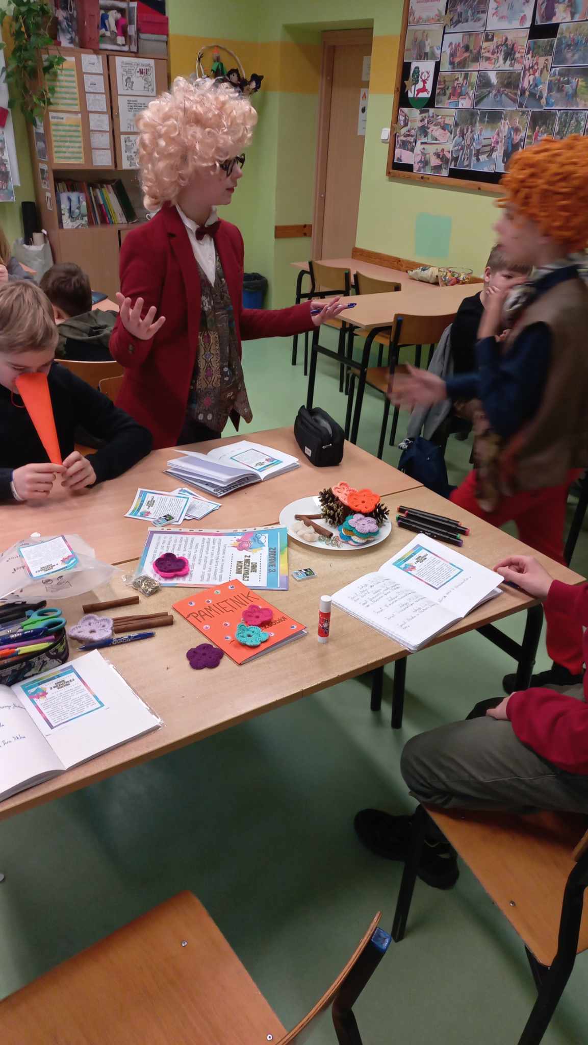 Czas minął wszystkim bardzo szybko. Atrakcyjności zajęciom dodały stroje przygotowane przez uczniów: był Pan Kleks, Adaś Niezgódka, a nawet szpak Mateusz, każdy przyozdobił swoją twarz kolorowymi piegami. Po feriach kolejne wyzwania.
