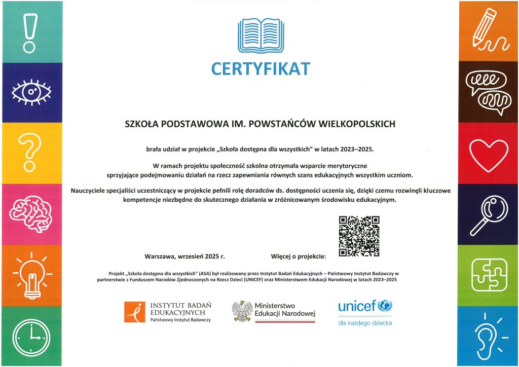 Projekt został pomyślnie zakończony, a szkoła otrzymała certyfikat potwierdzający zaangażowanie w budowanie dostępnej edukacji.