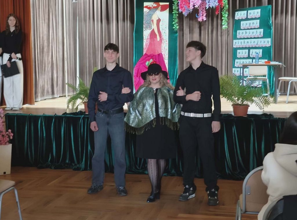 artystycznej. Otworzyły ją nagrania wypowiedzi uczniów naszej szkoły na temat kobiet oraz życzenia nauczycieli i chłopców dla wszystkich kobiet. Po tej części goście wysłuchali fragmentu dialogu ,,Małego księcia” i utwór ,,Mały książę” w wykonaniu Katarzyny Sobczyk. Wybrzmiała także poezja śpiewana, utworów takich jak.: „Niepewność” A. Mickiewicza i ,,Żal” A. Słonimskiego. Część poważna była przeplatana wesołą reklamą i dialogiem pomiędzy skąpym mężem, a żoną oraz wiadomościami sportowymi prezentującymi na wesoło osiągnięcia polskich kobiet. Po części oficjalnej odbył się koncert piosenek w wykonaniu uczennic: M. Jańczak, O. Szczepaniak, L. Młynarczyk i L. Burzyńskiej. Ostatni punkt