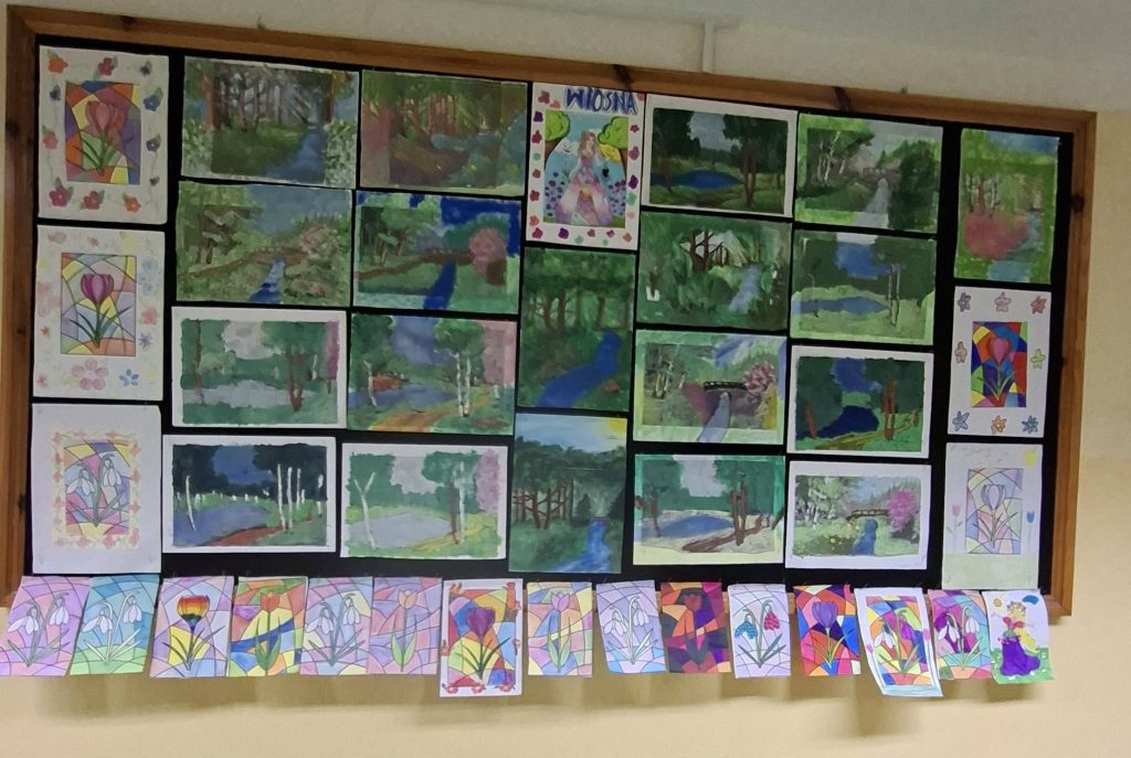 Wiosna powoli budzi się do życia, malując przyrodę pięknymi kolorami. Uczniowie klasy V b oraz klas szóstych i siódmych podczas lekcji plastyki malowali farbami plakatowymi i akrylowymi pejzaż wiosenny oraz kwiaty wiosenne i „Panią Wiosnę”. Najciekawsze prace zostały wywieszone na gazetce ściennej , w piwnicy budynku C, akcentując w ten sposób pierwsze powiewy wiosny.